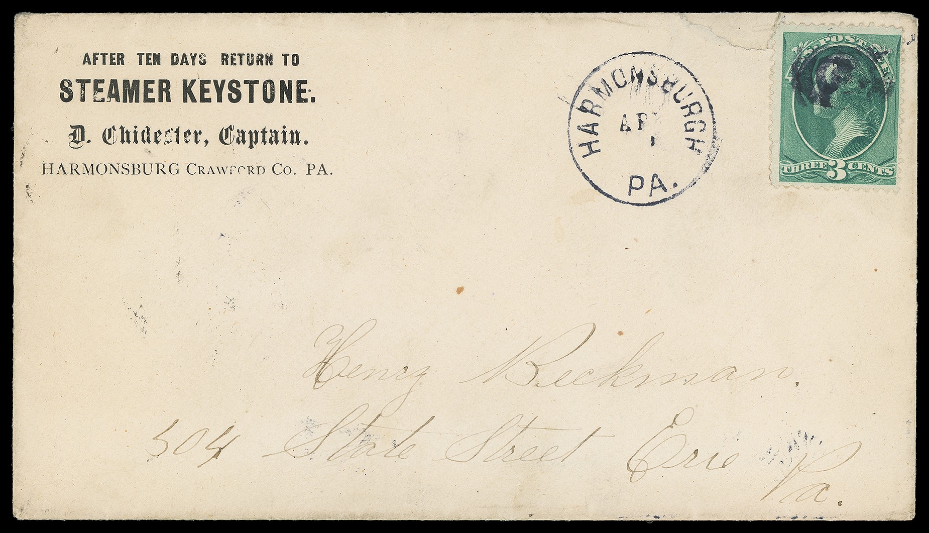 Keystone. Printed corner card on cover bearing 3¢ green (207) tied by blurry target cancel duplexed with "Harmonsburg Pa. Apr 1" cds to Erie Pa.; small opening tear at top, flap tears sealed on reverse, F.-V.F. Milgram No. 756;