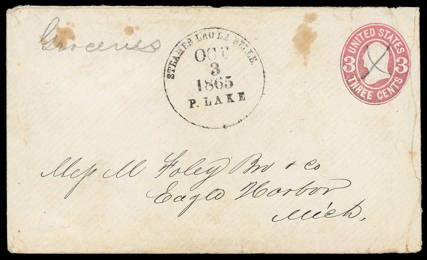 Belle, P. Lake (Great Lakes). Balloon "Oct. 3, 1865" cds on 3¢ pink (U58) entire canceled by pencil "X" to Eagle Harbor, Mich, pencil notation "groceries"; couple light stains and unevenly opened along right edge, still Very Fine and