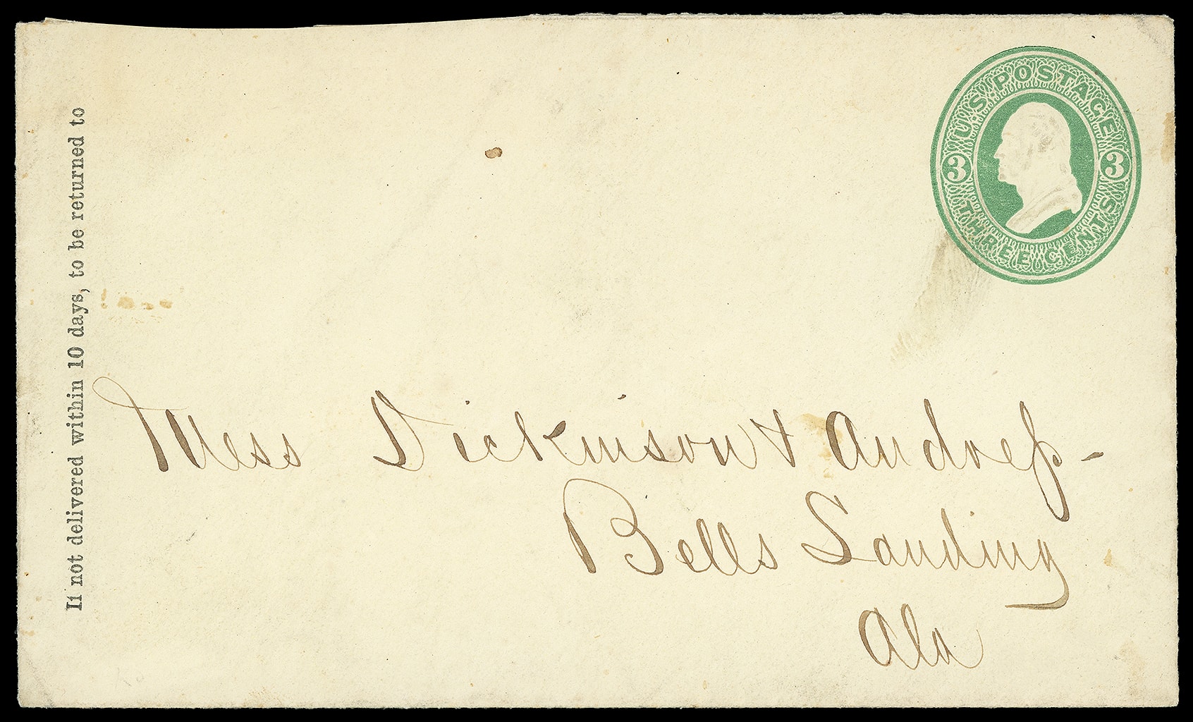 (Alabama River). Green and rose label affixed on reverse of 3¢ Green entire to Bells Landing, Ala.; partial backflap, also included is stunning 1873 multicolor printed and illustrated freight bill, Very Fine and rare. Milgram No.