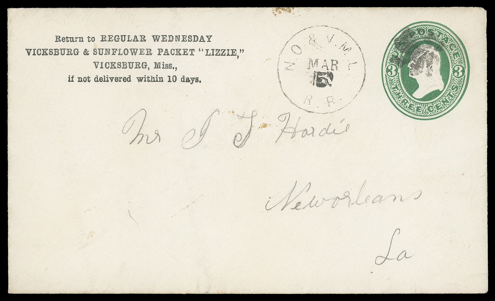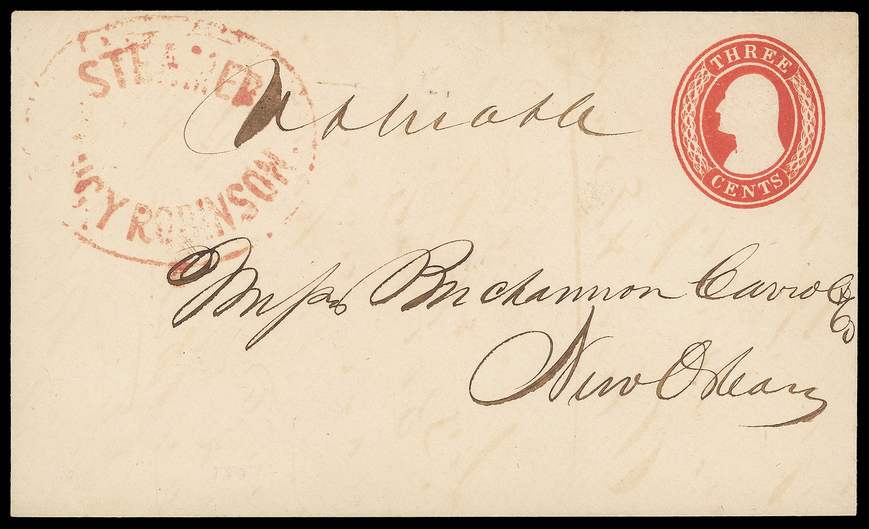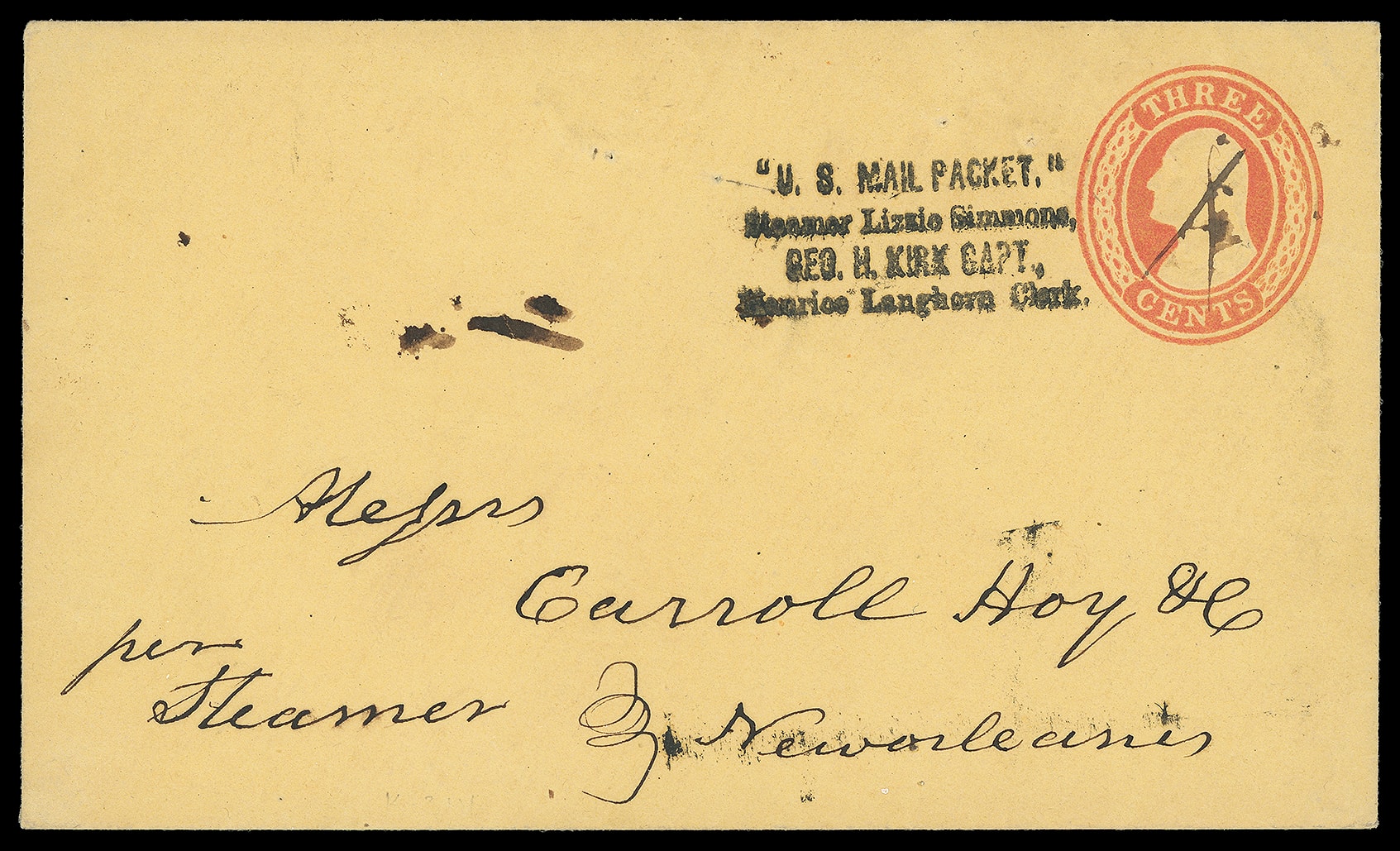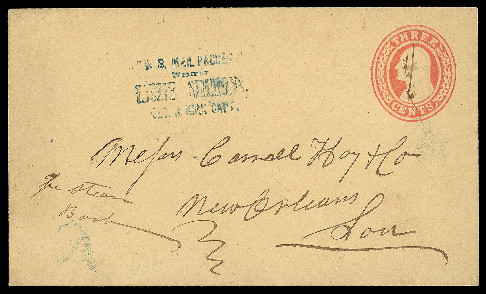Steamer Lizzie Simmons. Sharp 4-line handstamp on pen canceled 3¢ red (U9) Nesbitt entire from the Carroll Hoy & Co. correspondence to New Orleans La., scarce and Very Fine. Milgram No. 802; Estimate $300 - 400.