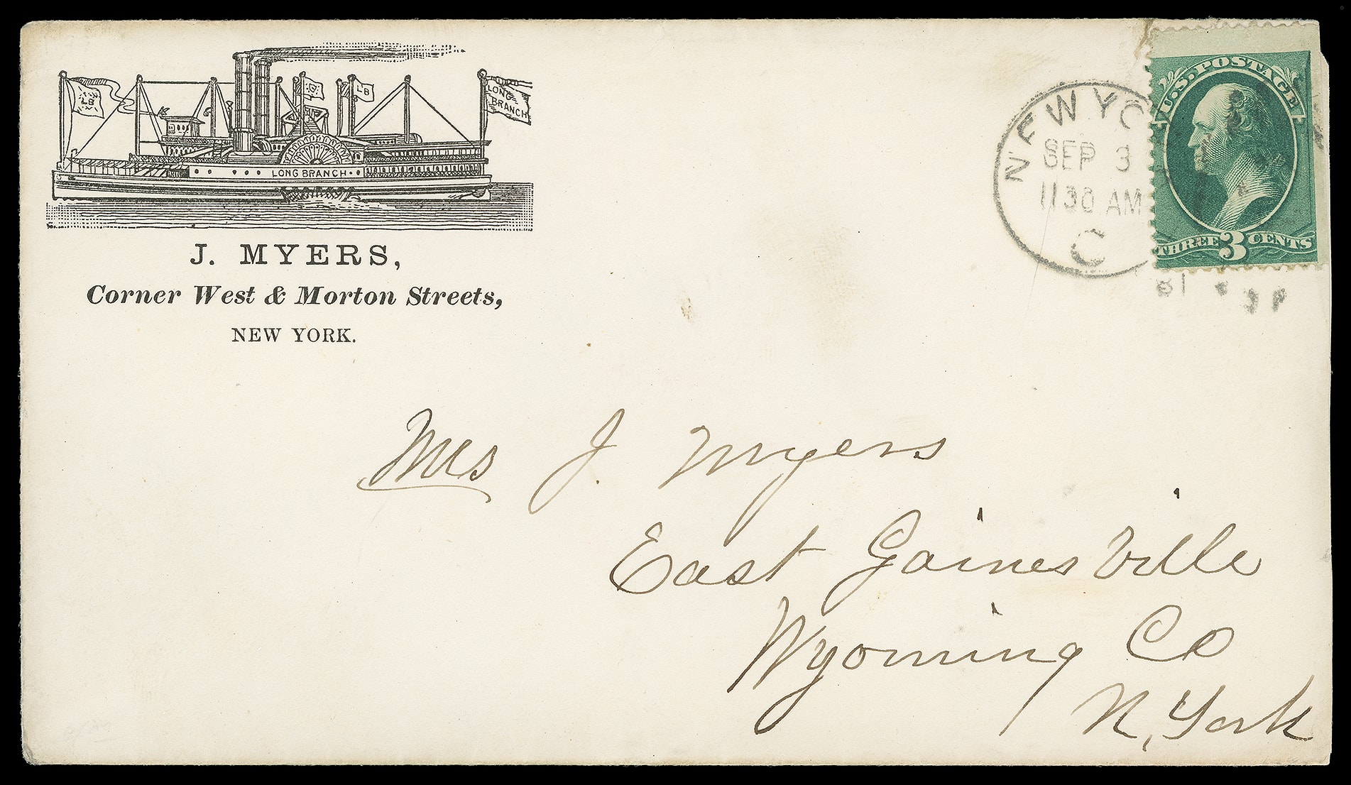 Branch. Attractive illustrated corner card on cover bearing 3¢ green (184) s.e., tied by "New York, C, Sep 3 '81" duplex to East Gainesville N.Y.; small edge tear, reduced slightly at right, otherwise Very Fine. Milgram No. 804C;