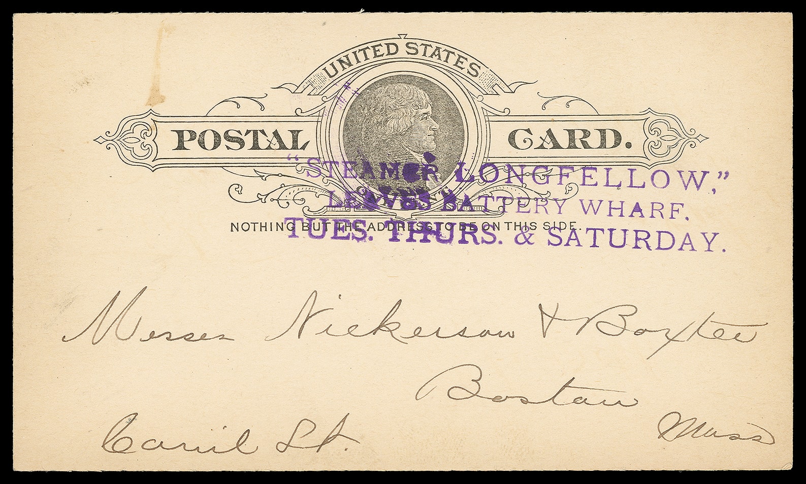 (Atlantic Coast). Bold purple three-line handstamp on 1¢ postal card (UX9) to Boston, 1890 message, Very Fine and attractive. Milgram No. 805; Estimate $150 - 200. (Image1)