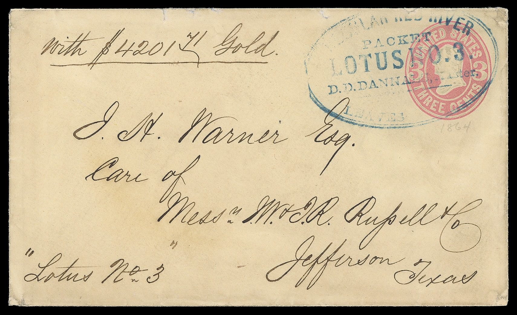Lotus No. 3 (Red River). Bold blue oval on 3¢ pink (U59) buff entire to Jefferson, Texas, endorsed "With $4,201.71 Gold" at top and "Lotus No. 3" at bottom left; flap repaired with small edge tears at top, Very Fine and