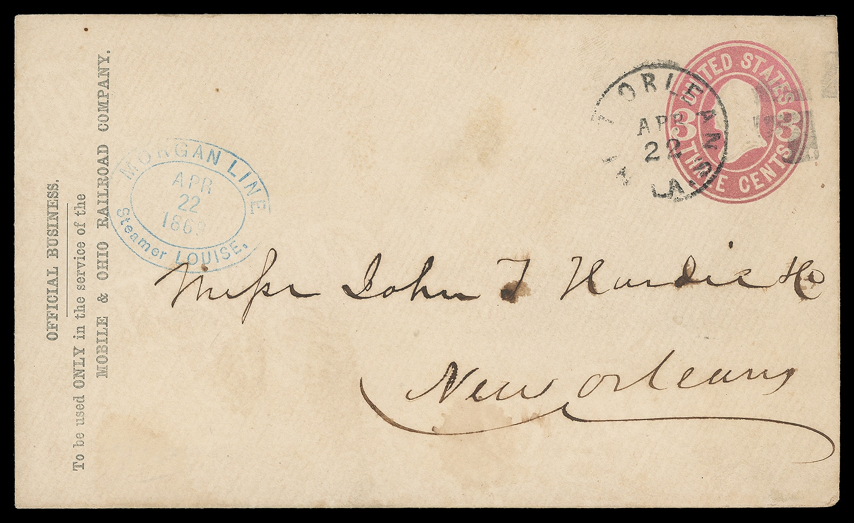 (Atlantic Coast). Blue "Apr 22, 1869" double-oval datestamp on 3¢ pink (U58) entire with "Official Business, Mobile & Ohio Railroad Co." corner card canceled by "New Orleans, La Apr 22" cds duplex from Hardie & Co. correspondence to New