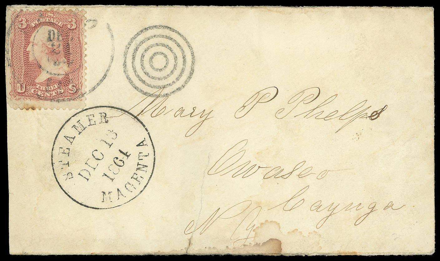 (Ohio River). Bold name of steamboat "Dec 13, 1864" cds on cover bearing 3¢ rose (65) small flaws, tied by indistinct "Cairo, Ill. Dec 24 '64" double-circle postmark to Owasco N.Y.; waterstaining at bottom and sealed cover tear, rare and