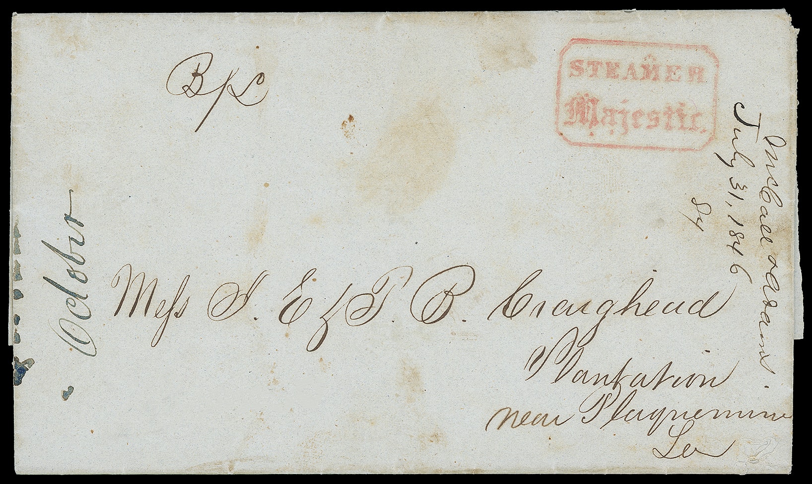 (Mississippi River). Red octagonal boxed handstamp on gray July 31, 1846 folded letter from New Orleans La. to Plaquemine La.; minor erosion bottom right, Very Fine, ex-Rohloff, Milgram. Milgram No. 844; Estimate $200 - 300.