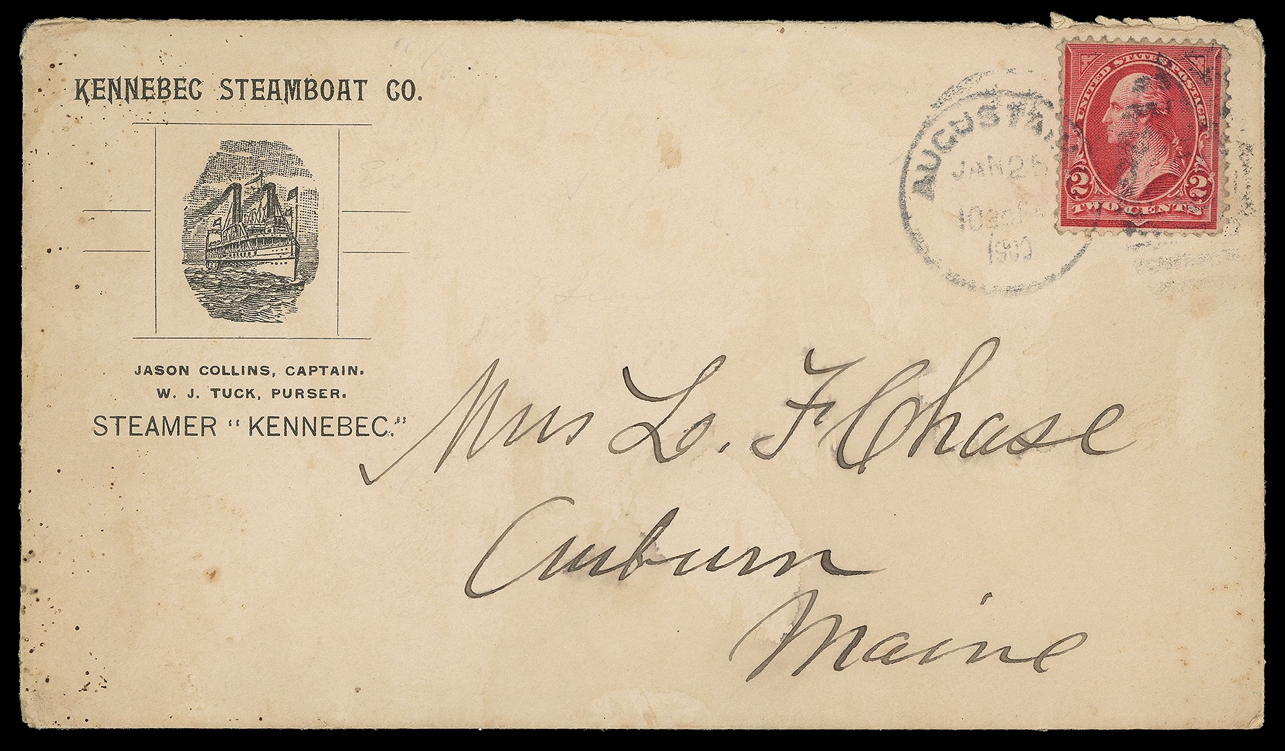 Co., Steamer Kennebec. Illustrated corner card on 1900 cover bearing 2¢ red (279B) tied by "Augusta Me. Jan 25, 1900" duplex to Auburn, Maine with matching printed letterhead, F.-V.F. Milgram No. 750A; Estimate $100 - 150. (Image1) (Image2)