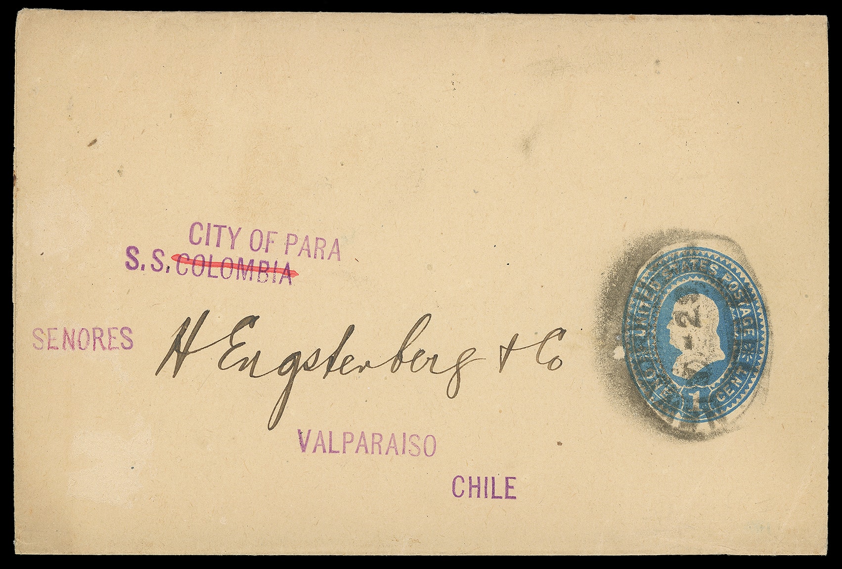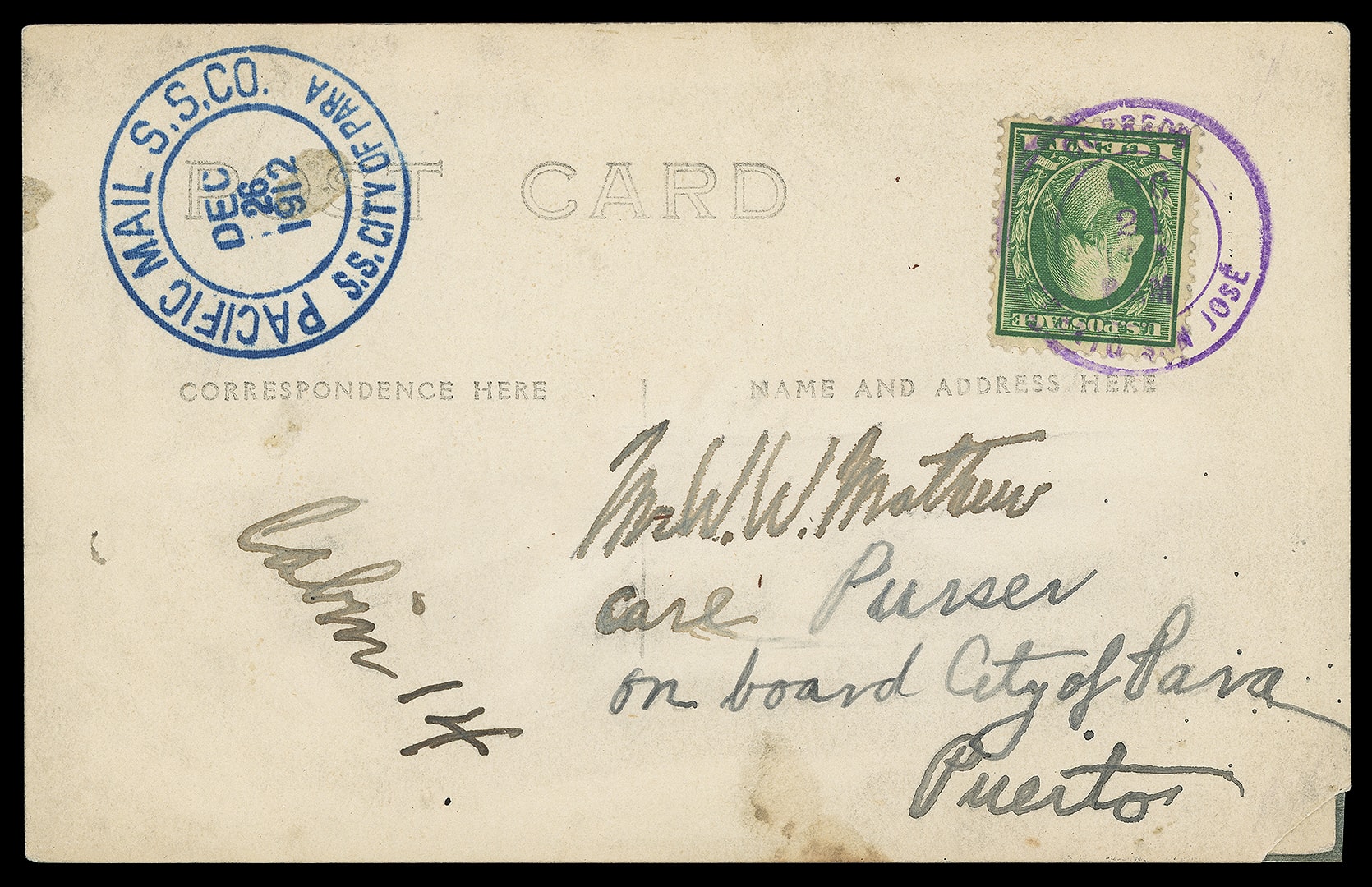 Washington-Franklin tied by violet San Jose, Costa Rica postmark to the "Purser on board the City of Para" with bold blue double circle handstamp "Pacific Mail S.S. Co., S.S. City of Para"; card with small corner repair, F.-V.F.,