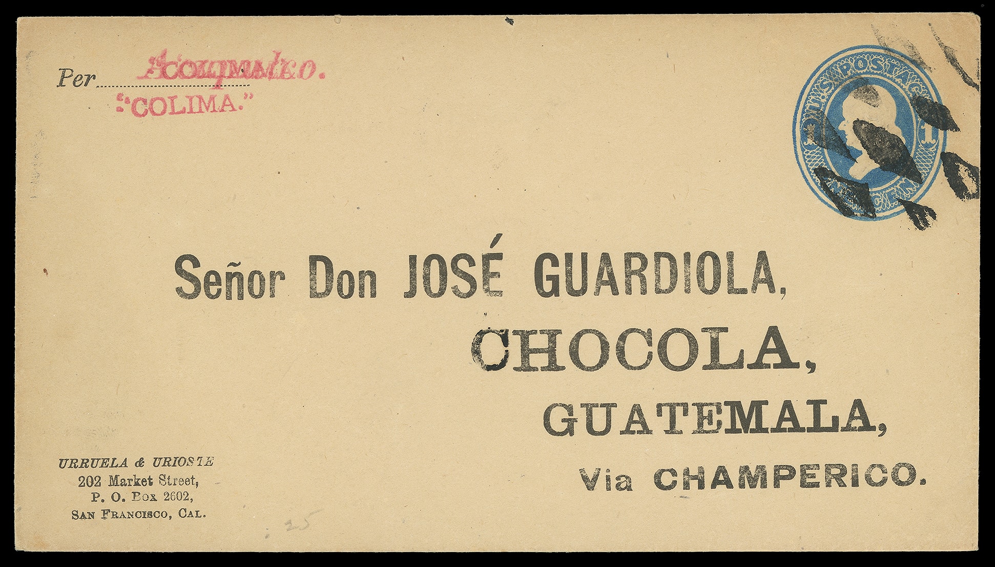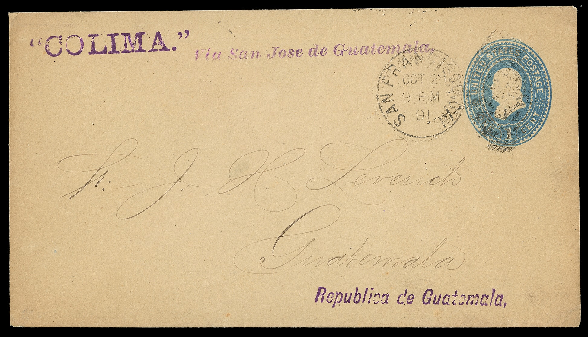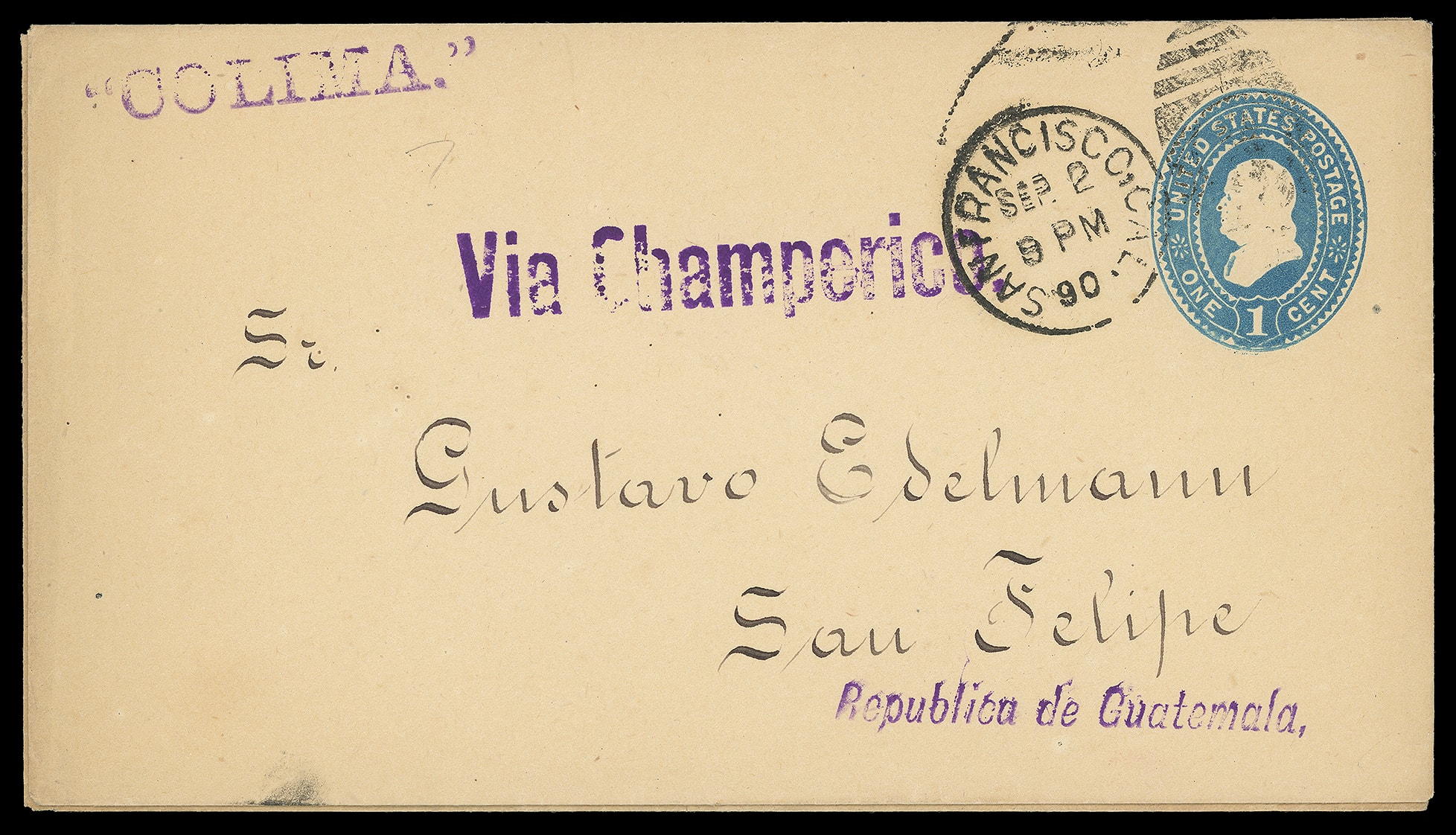 Colima. Three different directional straightlines on 1¢ postal entires all addressed to Guatemala, Very Fine trio, ex-Milgram. Milgram No. 263B; Estimate $75 - 100. (Image1) (Image2)