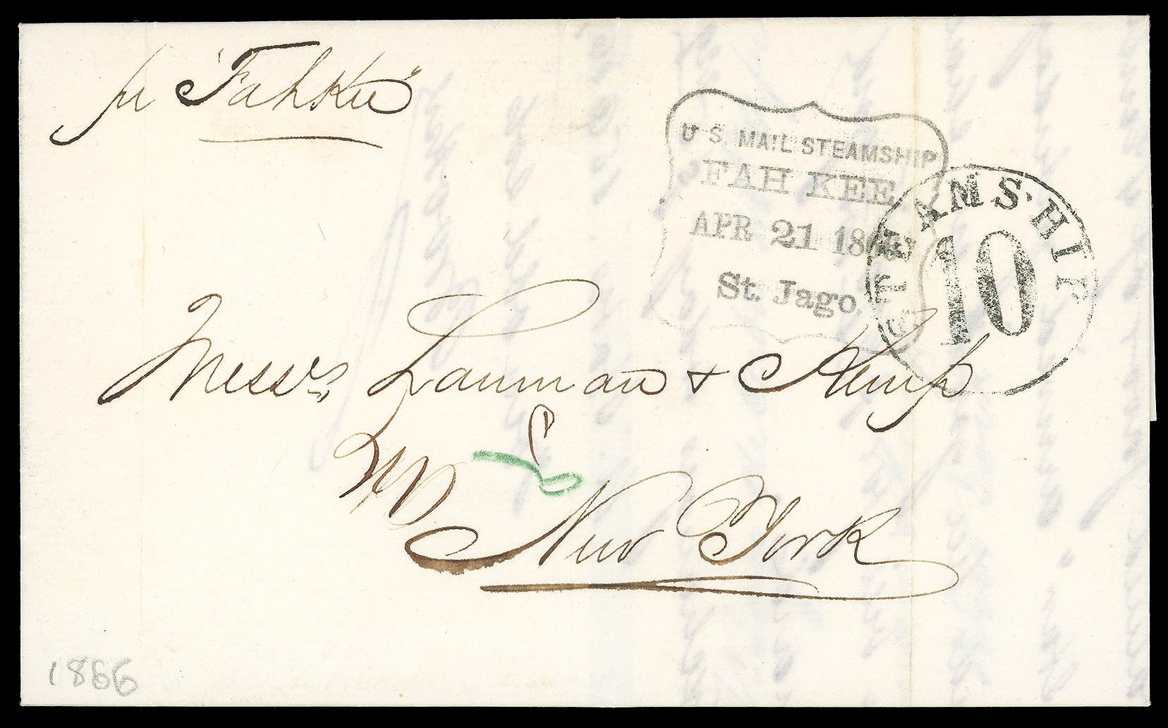 Fah Kee (Atlantic Ocean). Bold strike of "Apr 21, 1866, St. Jago" shield handstamp on folded letter datelined "St. Jago de Cuba, 20th April 1866" from the Lanman & Kemp correspondence to New York City where "Steamship 10" cent due circular