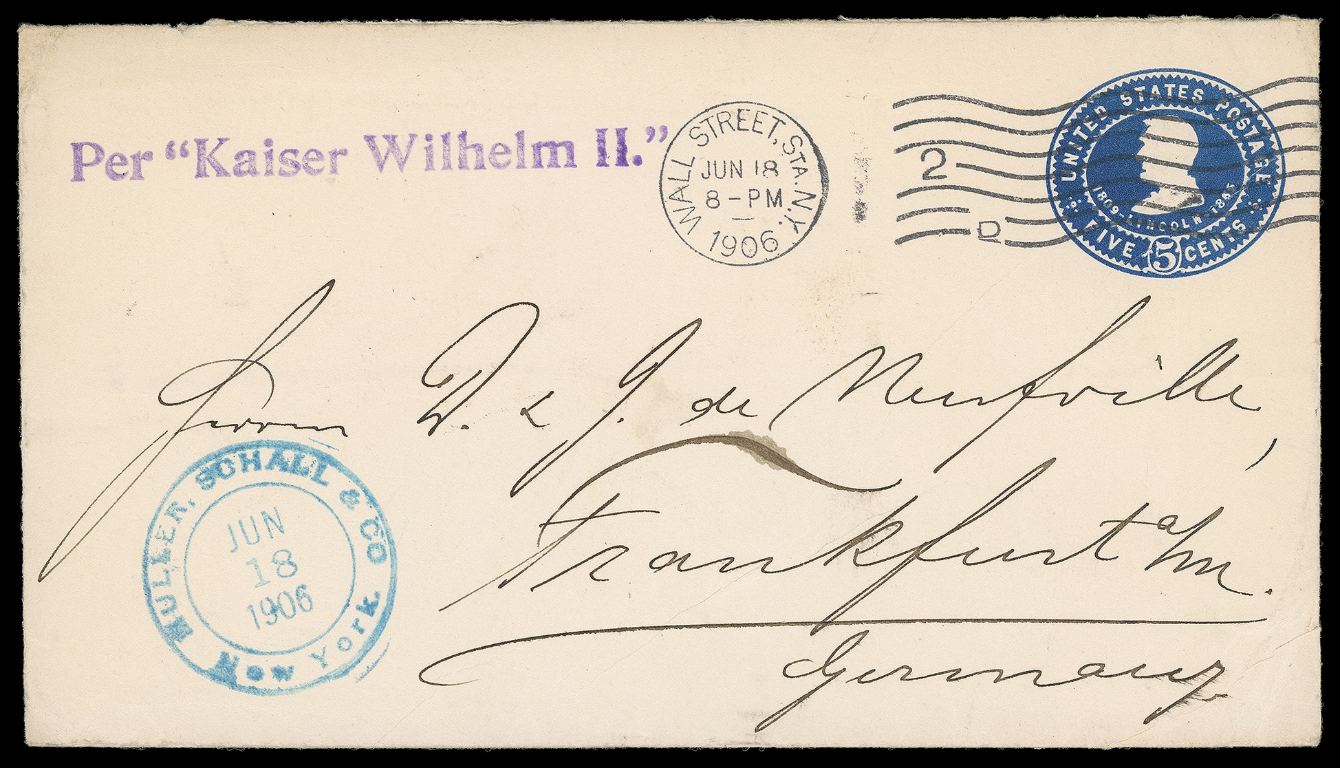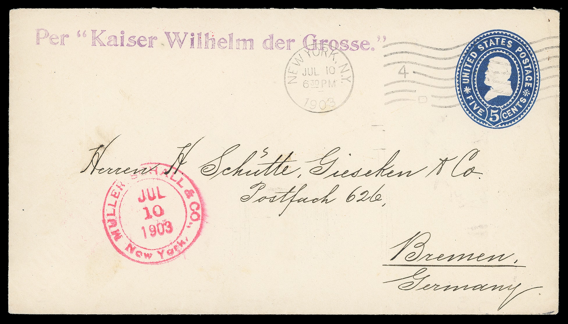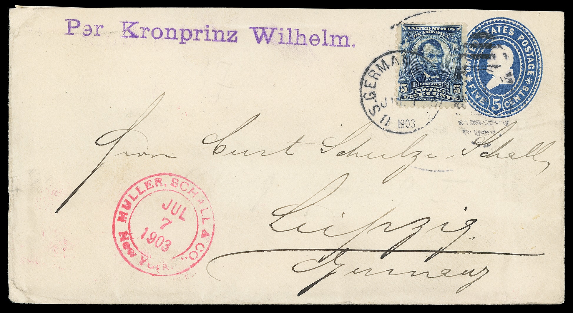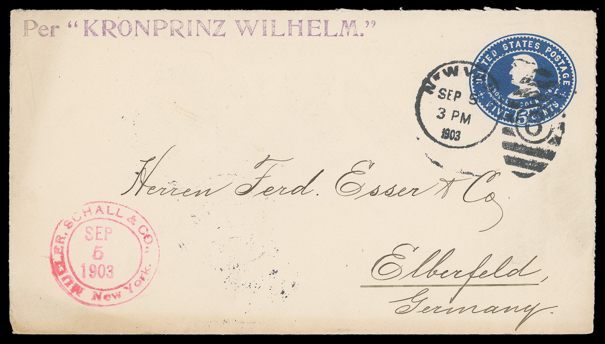 Wilhelm. Three different Schall "Per Kronprinz Wilhelm" directional handstamps on three 5¢ entires to Germany, one uprated with 1901 5¢ tied by U.S. German Sea Post Office duplex, Very Fine, ex-Milgram. Milgram No.