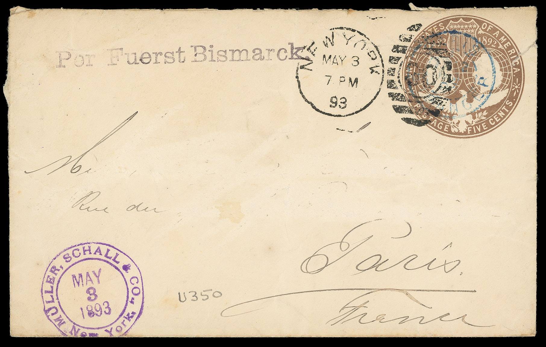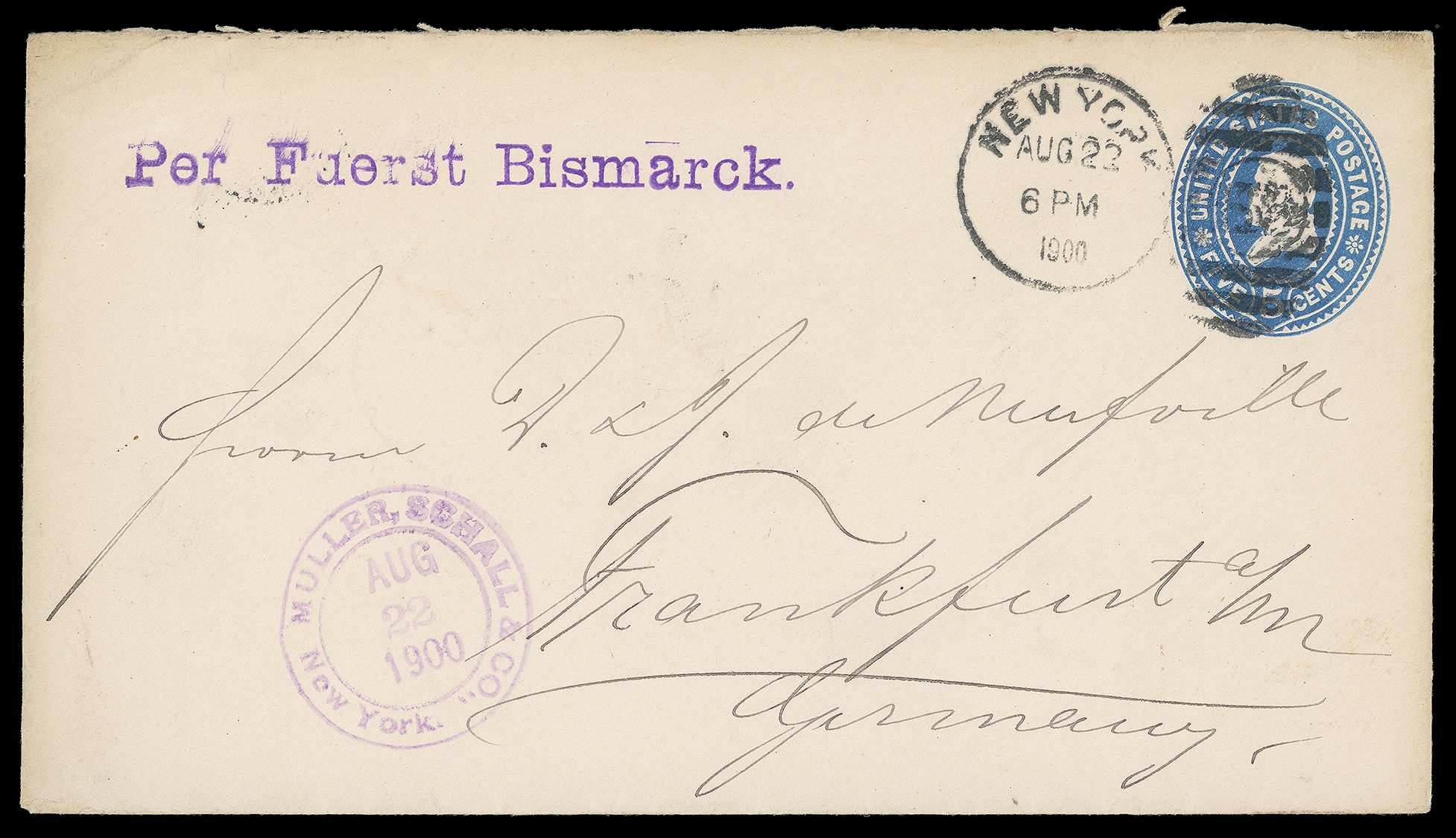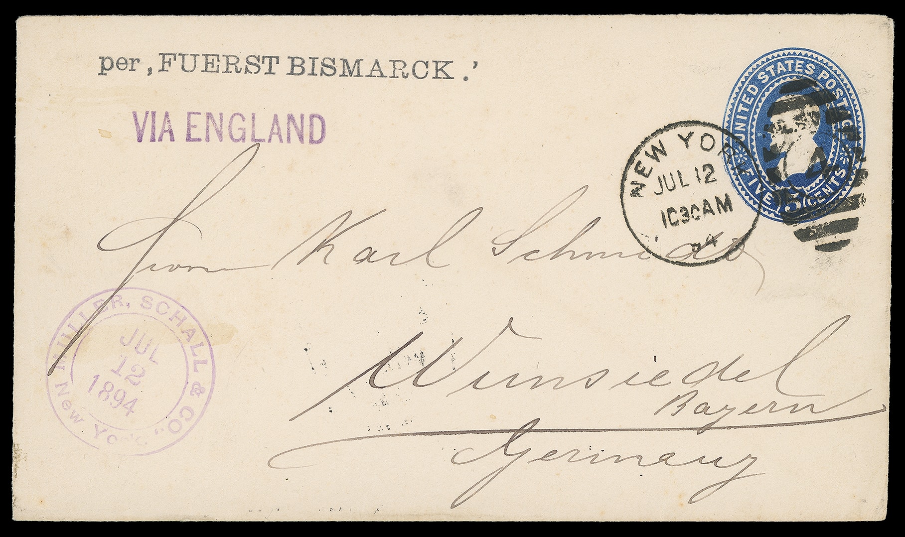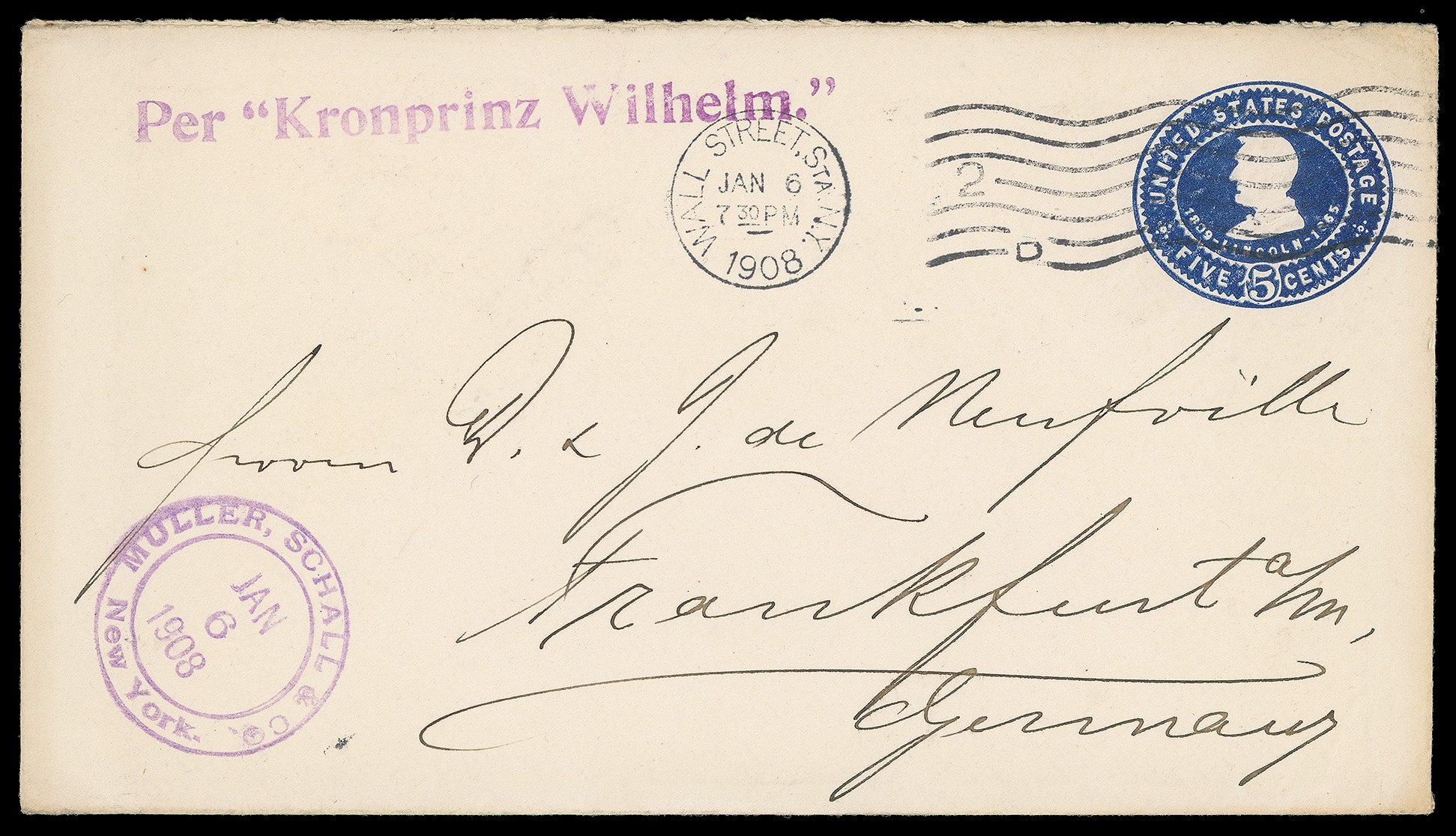 Wilhelm. Three different Schall "Per Kronprinz Wilhelm" directional handstamps on three 5¢ entires to Germany, one uprated with 1901 5¢ tied by U.S. German Sea Post Office duplex, Very Fine, ex-Milgram. Milgram No.