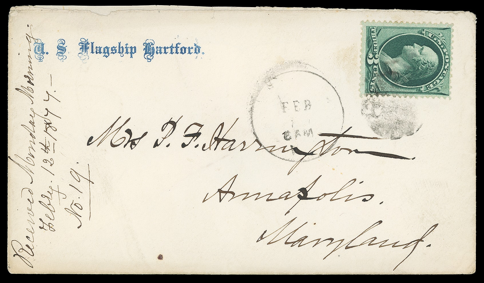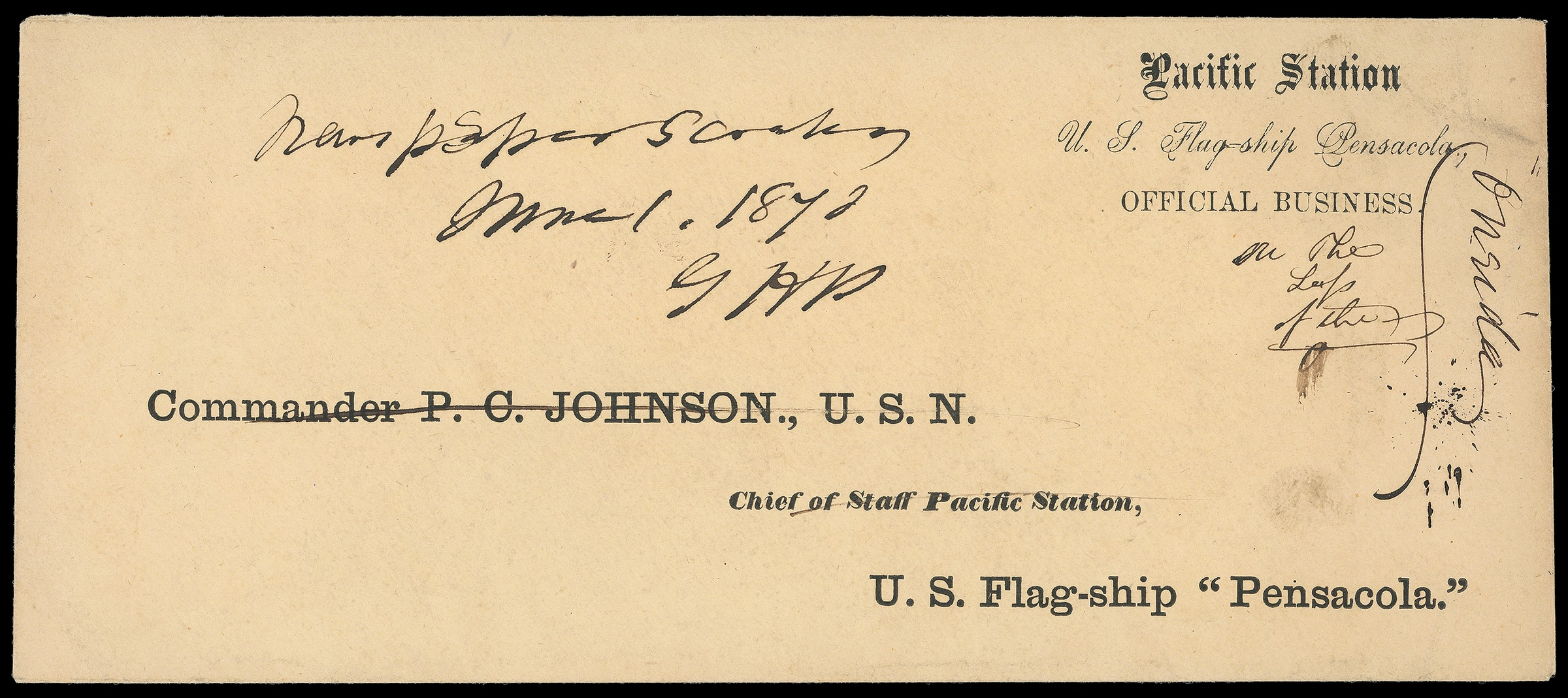 U.S. Flag-Ship Pensacola (Pacific Ocean). Official Business imprint on legal size cover with printed address to the Commander P.C. Johnson., U.S.N., U.S. Flag-Ship "Pensacola" with name of addressee crossed out; "June 1, 1872" docketing, Very