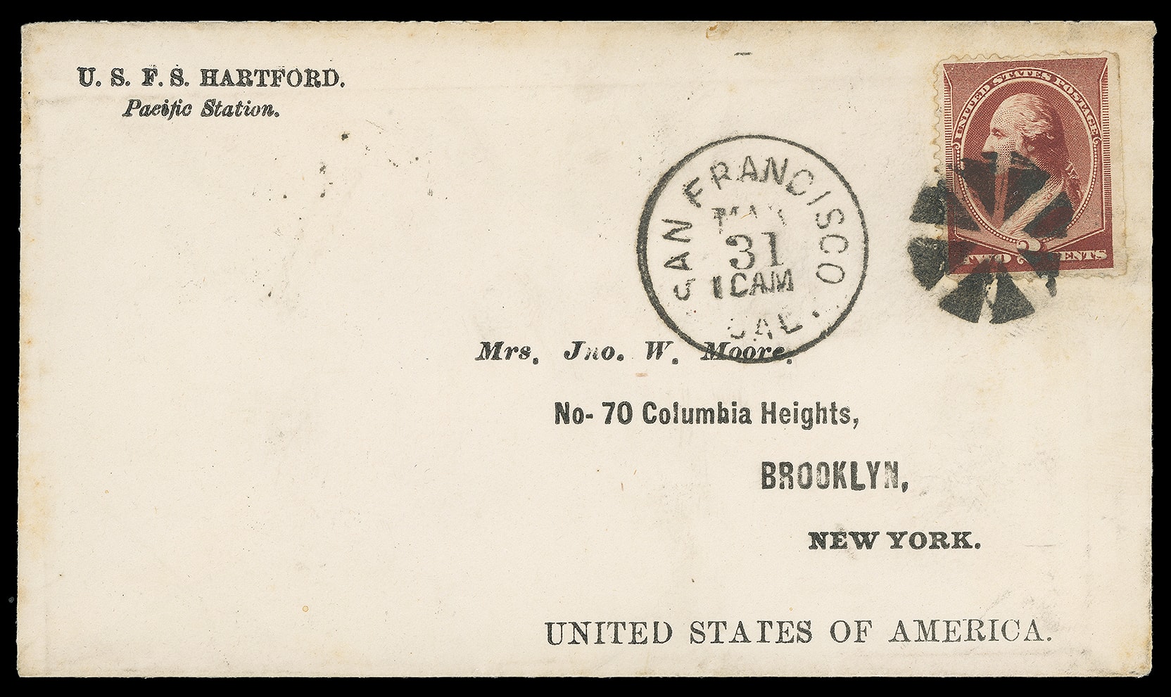 Pacific Station (Pacific Ocean). Printed corner card on cover bearing 2¢ red brown (210) s.e., small flaws, tied by circle of wedges cancel duplexed with "San Francisco Cal. Mar 31" cds with preprinted address to Brooklyn N.Y., Very