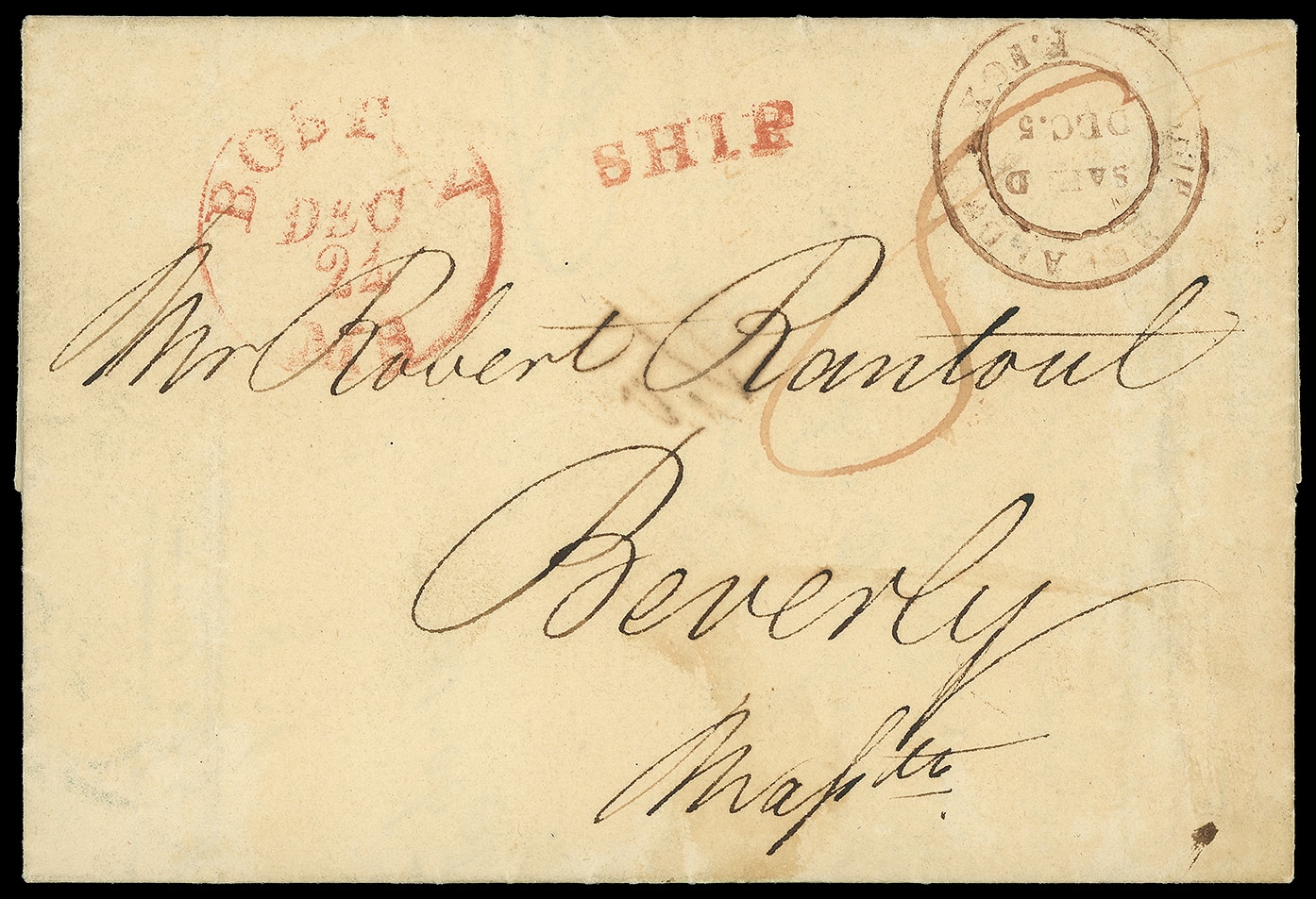 Fox, Sailed Dec 5 (Atlantic Ocean). Red double-circle datestamp on 1819 folded letter from London, England to Beverly Mass. entering the mails with red "Boston Ms. Dec 24" cds and matching "Ship" straightline with manuscript "8" rating, reverse