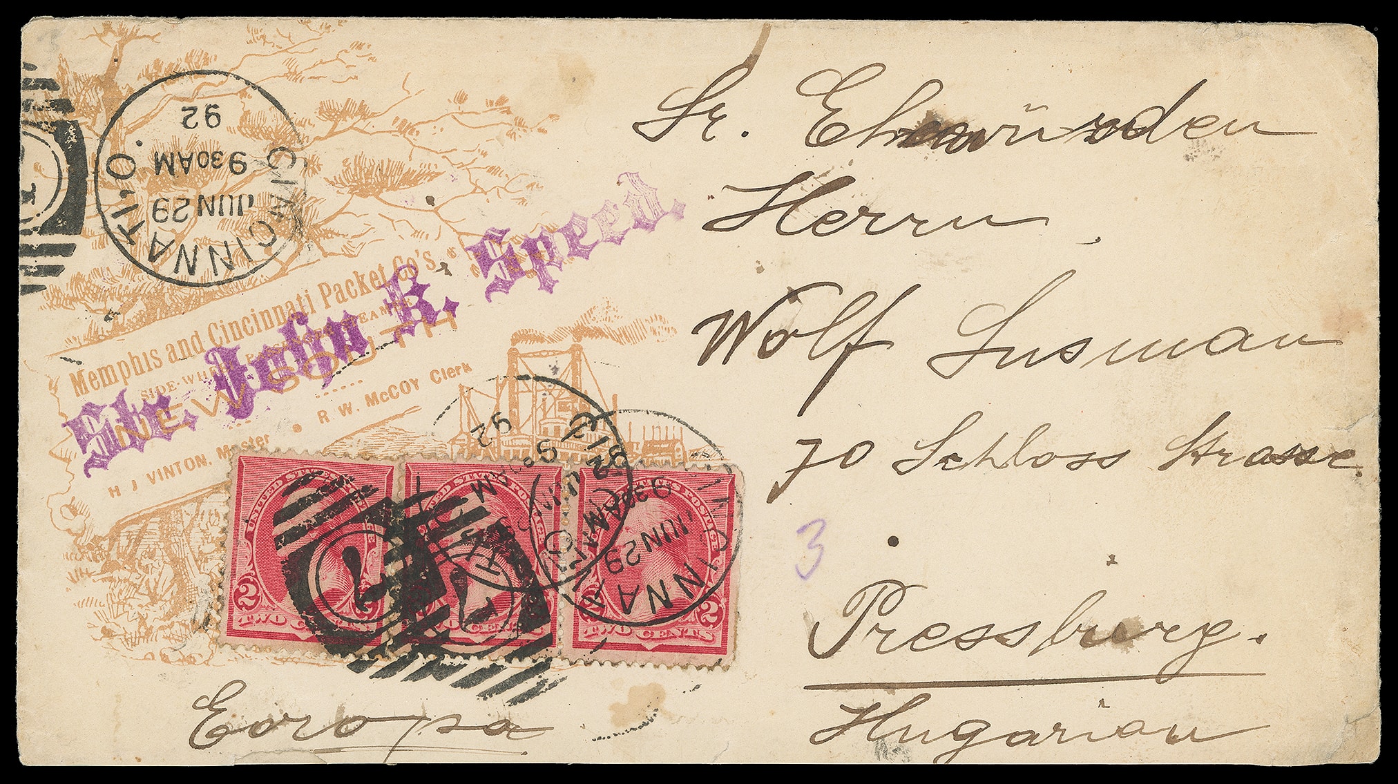 Speed. Bold purple straightline over elaborately illustrated corner card for "Memphis and Cincinnati Packet Co., Steamer New South" on cover bearing three 2¢ carmine (220) singles tied by "Cincinnati, O. Jun 29 92" cds duplex strikes