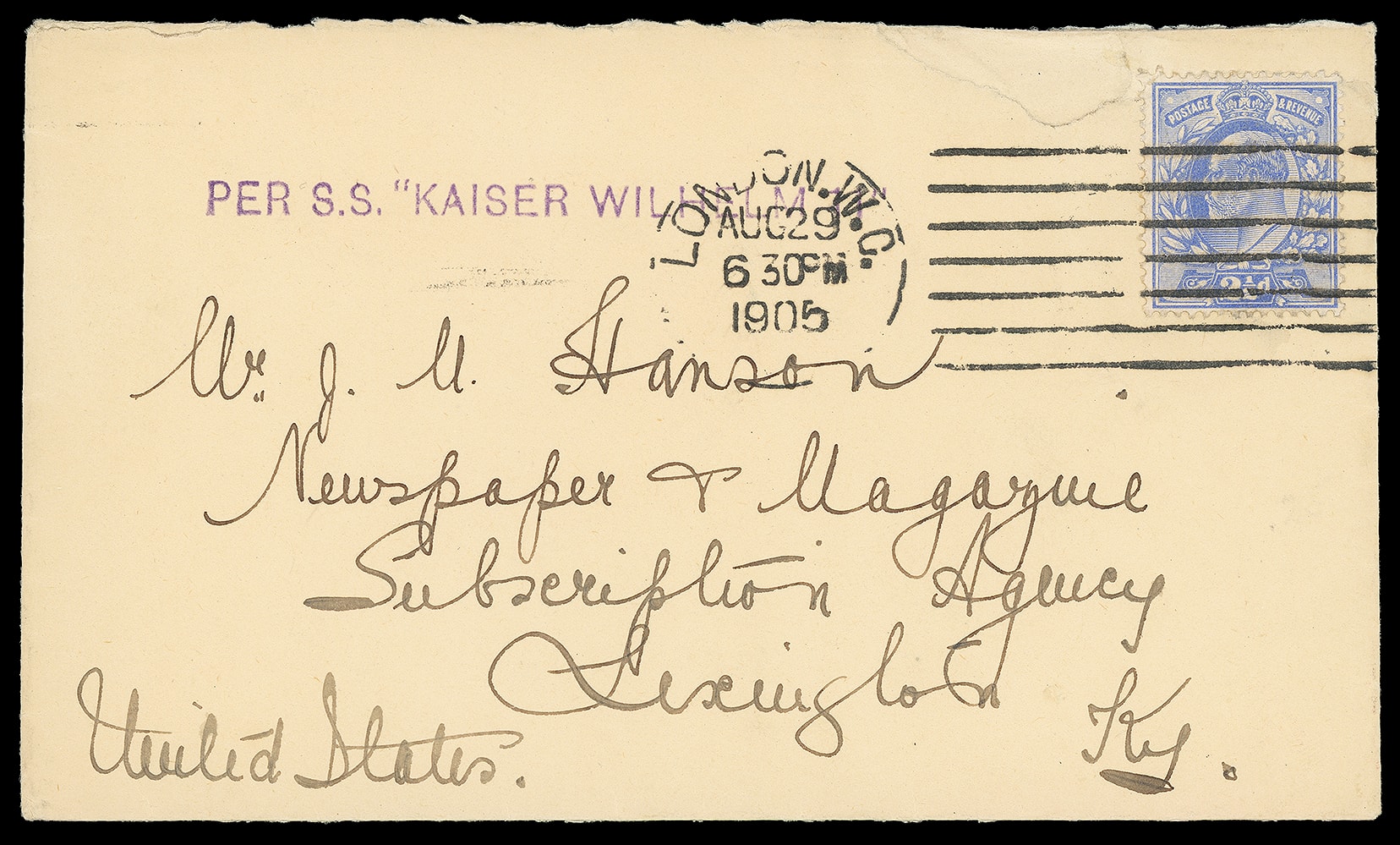 Wilhelm der Grosse. Three different "Per Kaiser Wilhelm der Grosse" purple straightlines on two U.S. Postal entires and one Great Britain cover, U.S. entires addressed to Germany and G.B. cover to the U.S., Very Fine, unlisted in Milgram,