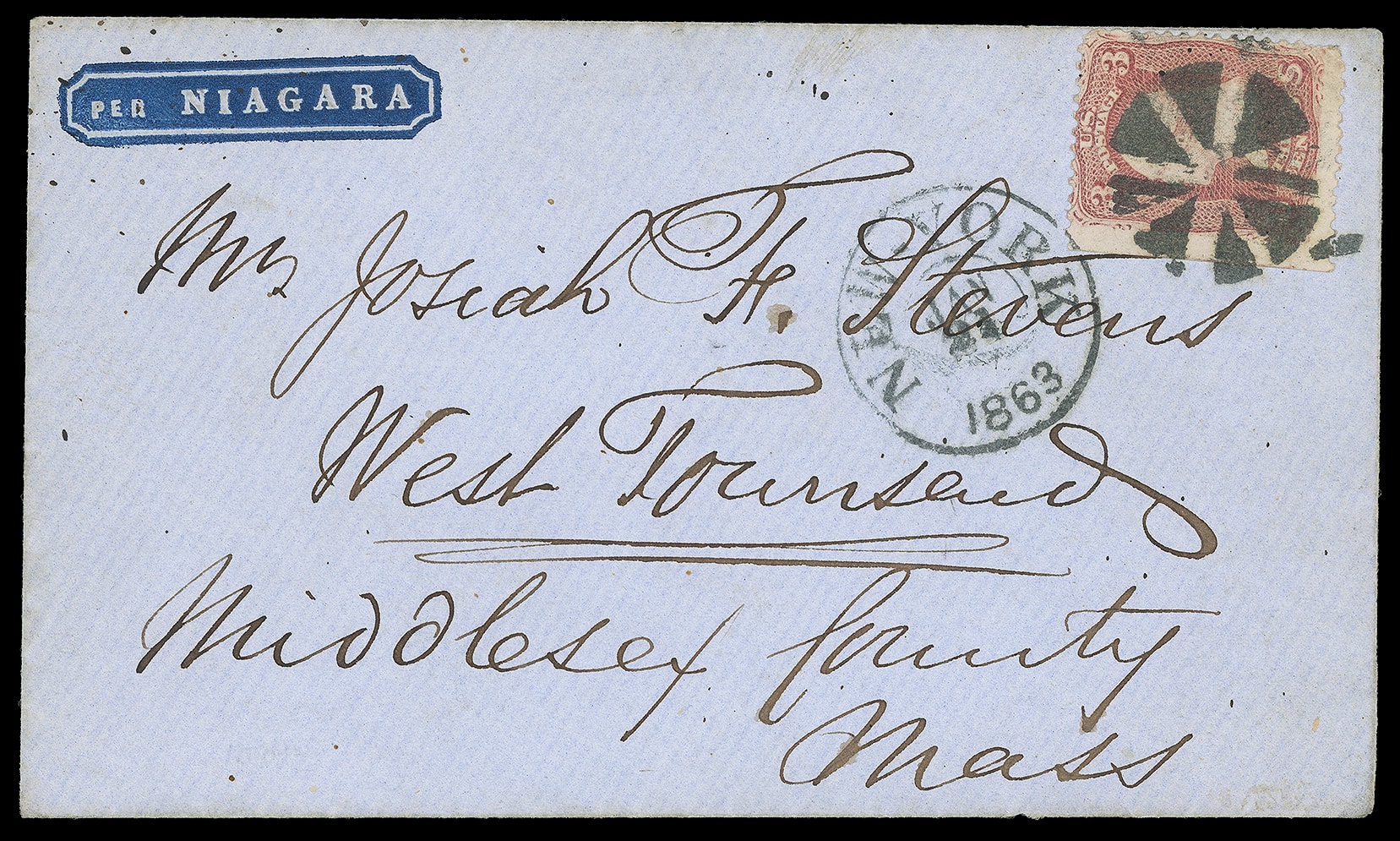 (Atlantic Ocean). Blue embossed cameo corner card on blue cover bearing 3¢ rose (65) s.e., tied by circle of wedges duplexed with "New York, Jan 21, 1863" cds to West Townsend, Mass., Very Fine and attractive, only recorded example,