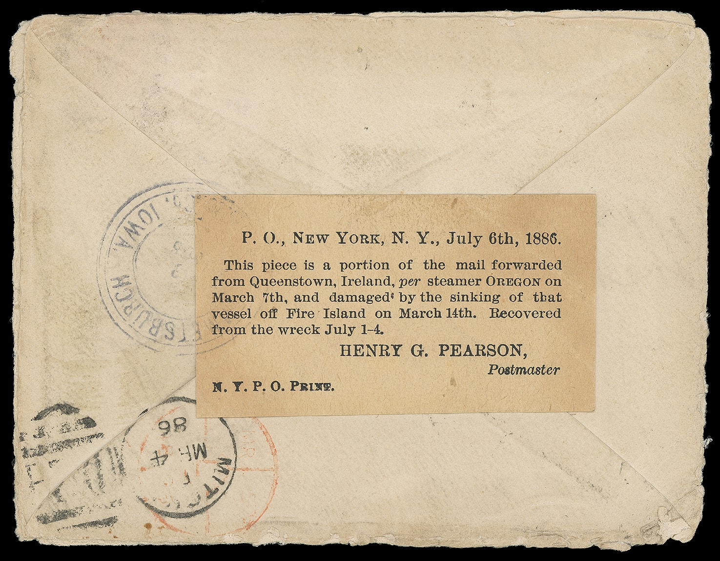 Printed July 6th, 1886 wreck label affixed on reverse of cover from England to Iowa, label tied by "Emmitsburgh, Iowa arrival postmark, the stamp has soaked off as always, front and back mostly separated, Very Fine for this and with the