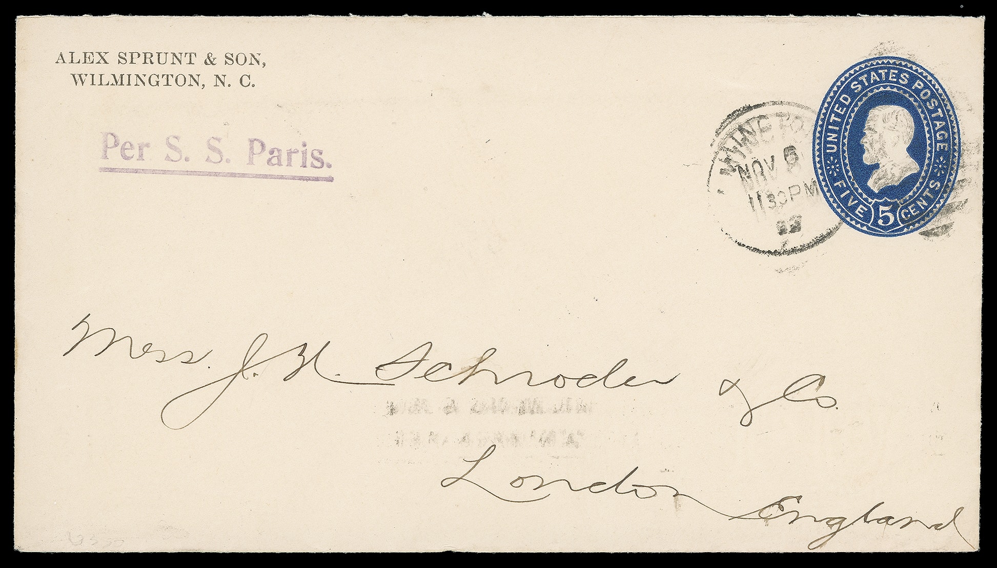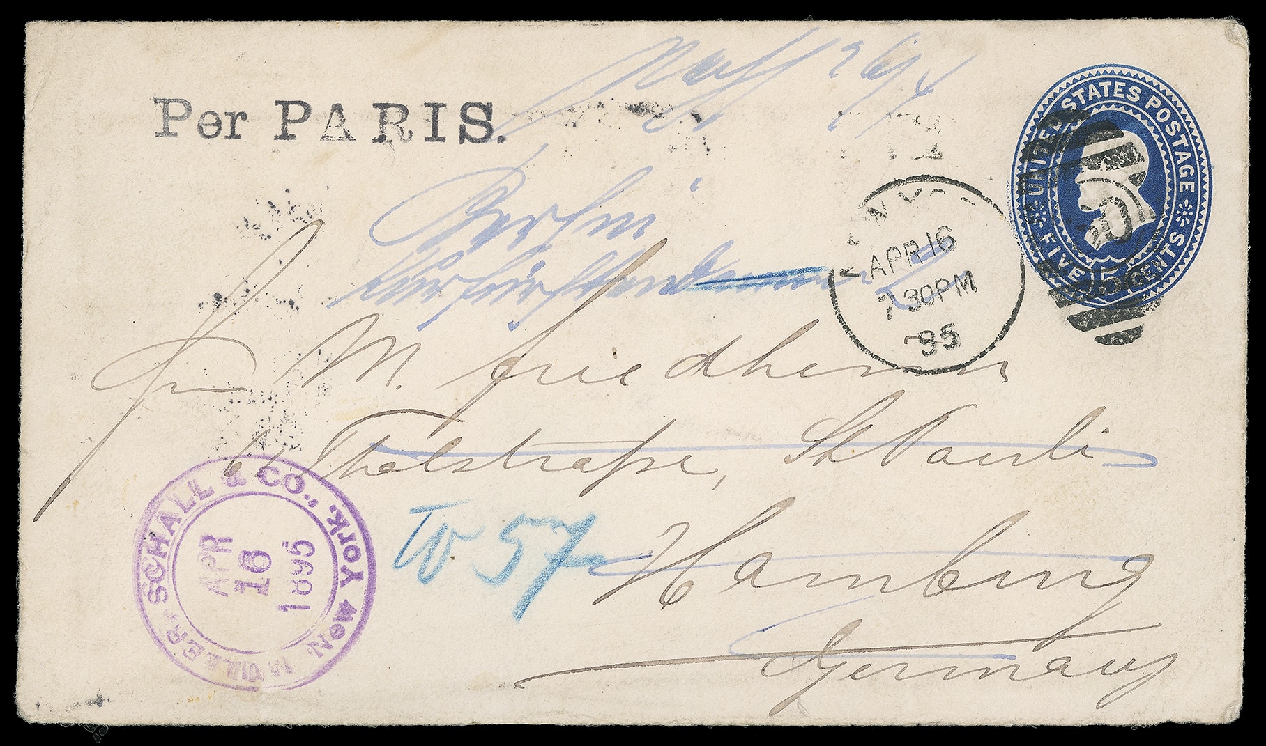 Paris. Two different Schall straightline directives on two 5¢ postal entires, one 1895 to Germany and second 1897 to London, Very Fine, ex-Milgram. Milgram No. 1054A-B; Estimate $50 - 75. (Image1) (Image2)