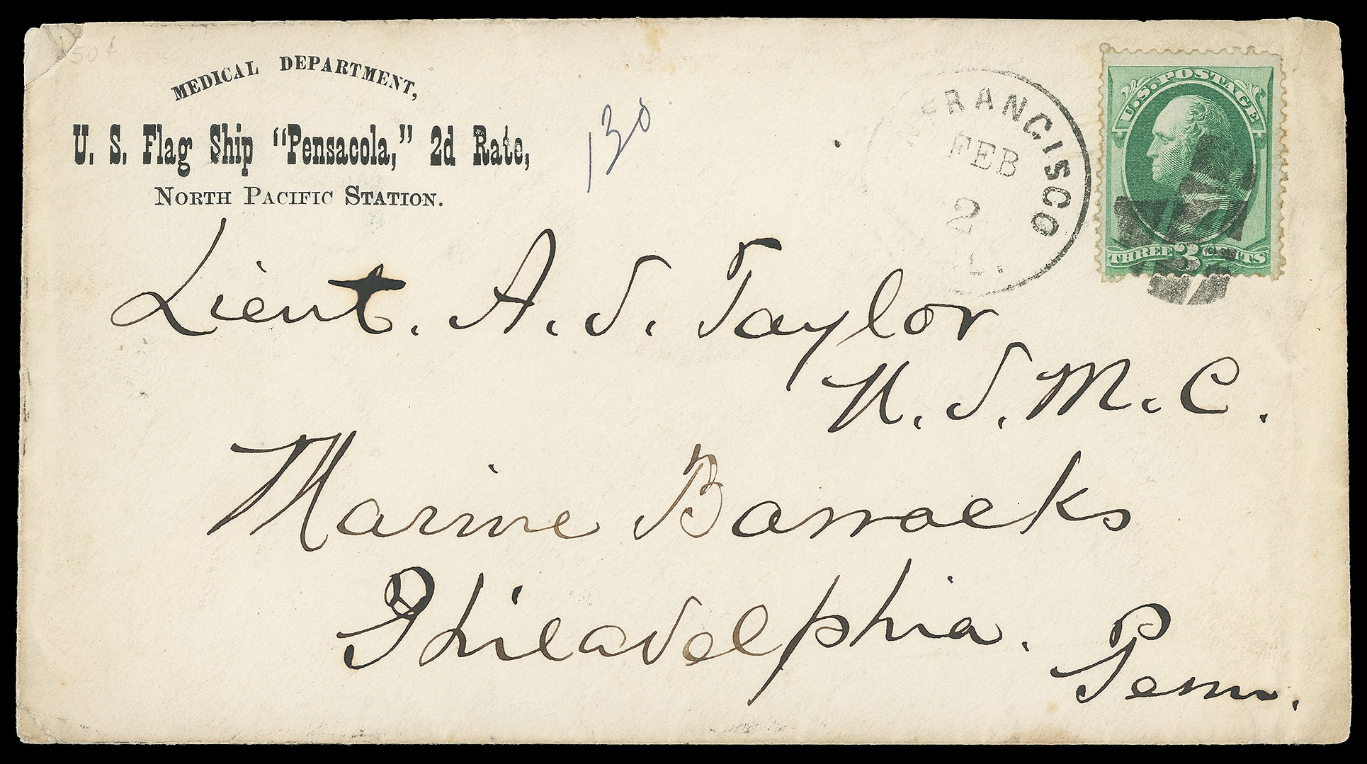 "Pensacola," 2d Rate, North Pacific Station (Pacific Ocean). Printed corner card on cover bearing 3¢ green (147) tied by geometric cancel duplexed with "San Francisco Cal. Feb 2" cds to a Lieut. in the "U.S.M.C, Marine Barracks,