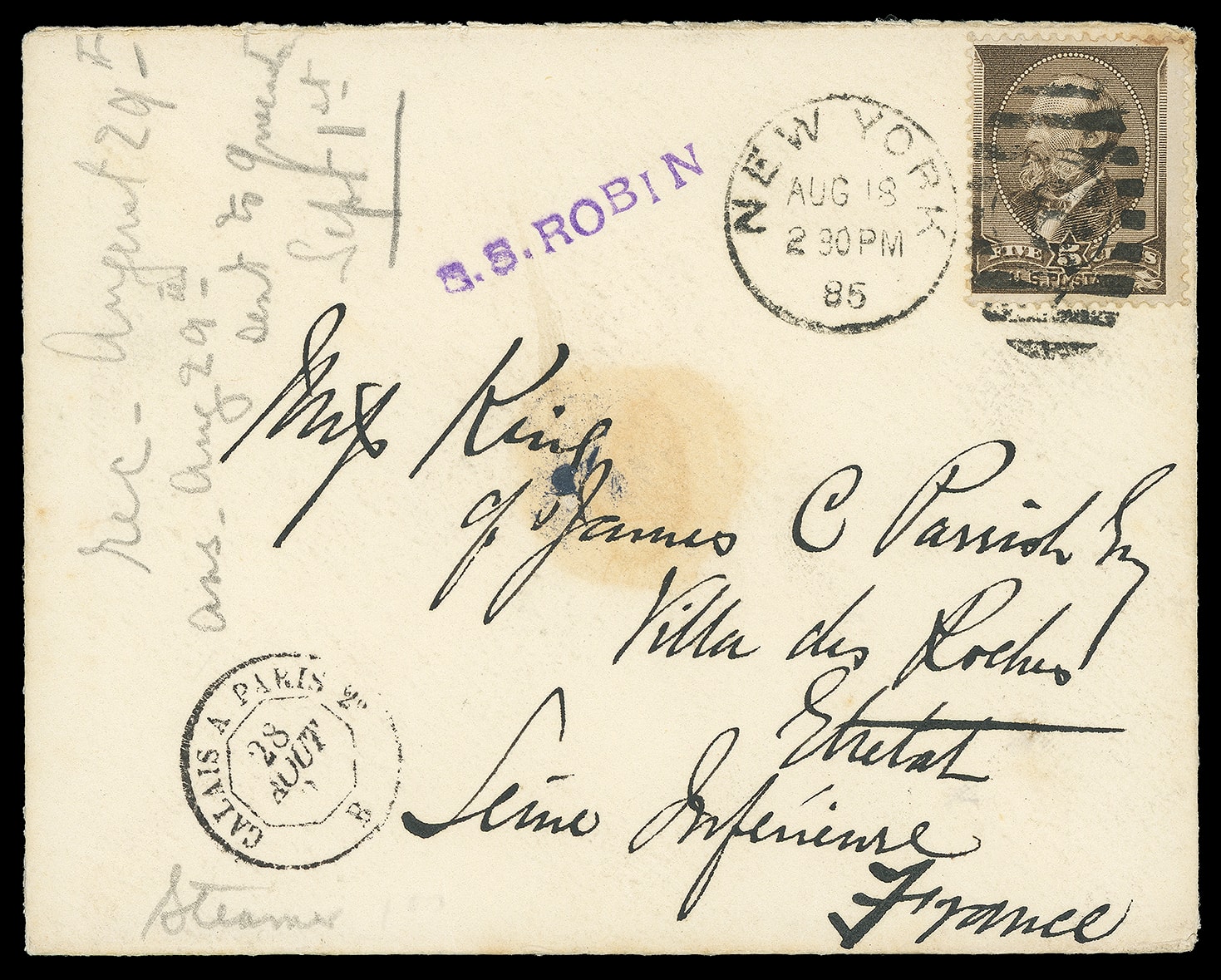 Violet handstamp on 1885 cover bearing 5¢ brown (205) tied by "New York Aug. 18, '85" duplex to France; light toned spot at center, F.-V.F., ex-Milgram. Milgram No. 1204A; Estimate $50 - 75. (Image1)