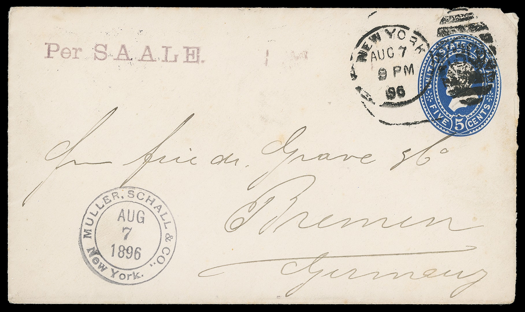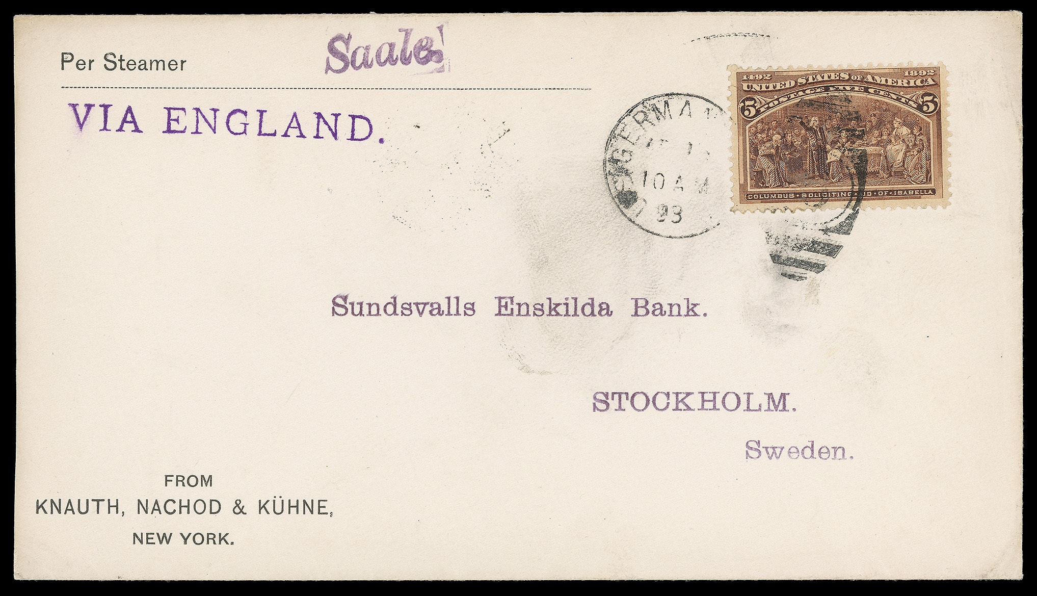 (Atlantic Ocean). Two different Saale directive handstamps on two covers to Europe, one 5¢ entire to Germany and one 5¢ Columbian (234) to Sweden, Very Fine pair, ex-Milgram. Milgram No. 1235A-B; Estimate $50 - 75. (Image1) (Image2)