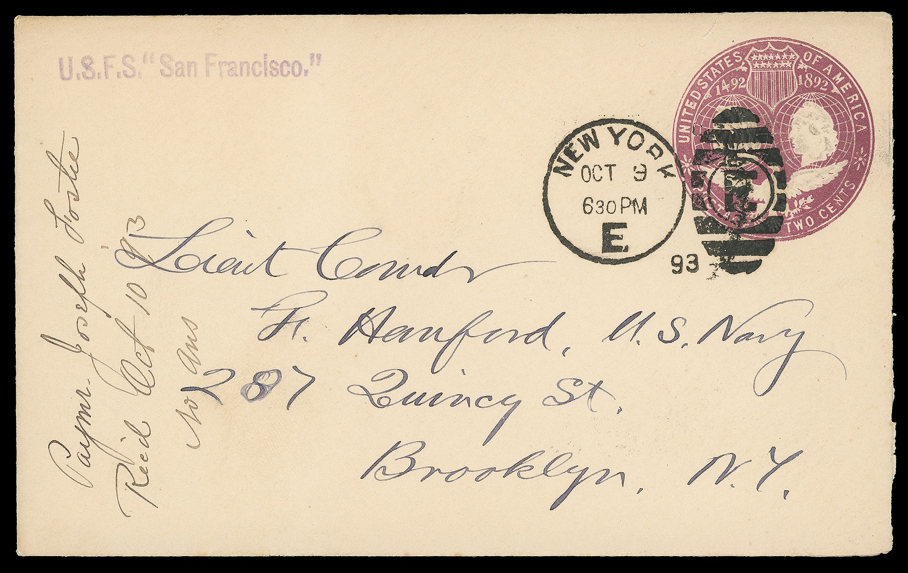 Francisco". Violet straightline on 2¢ Columbian postal entire canceled by bold "New York 'E' Oct 9 '93" duplex to Ft. Hanford, U.S. Navy, Brooklyn, N.Y., postmarked bold 1893 New York duplex cancel, Very Fine,