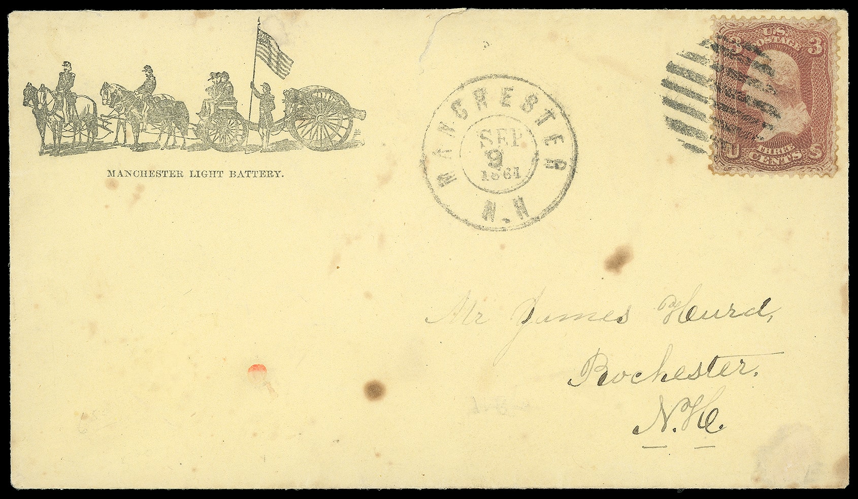 Light Battery. Gray patriotic design showing horse-drawn cannon on cover bearing 3¢ rose (65) tied by open circular grid cancel, matching "Manchester N.H. Sep 9, 1861" cds to Rochester N.H.; small edge tear, couple tone spots, Very
