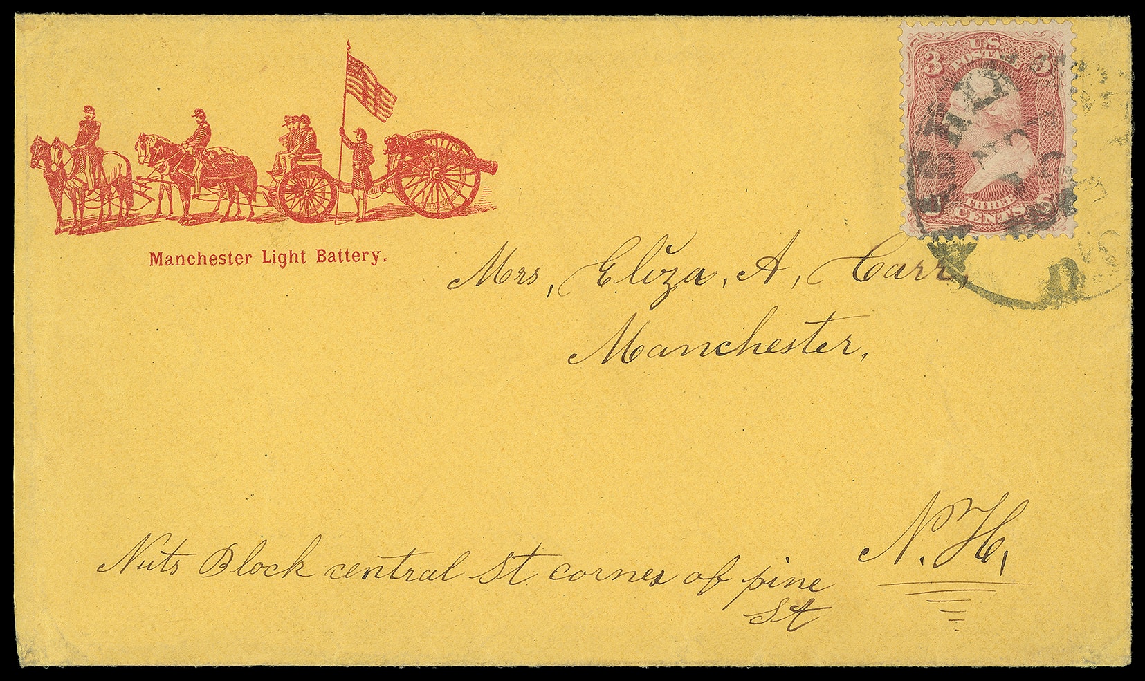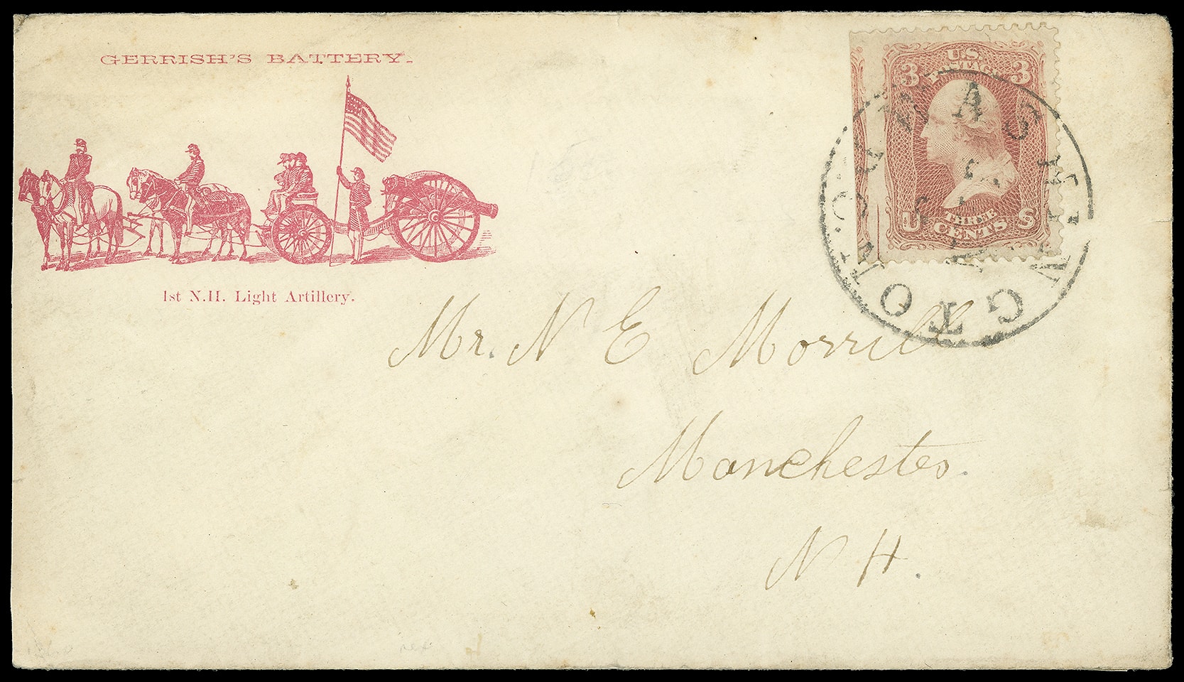 1st N.H. Light Artillery. Red patriotic design showing horse-drawn cannon on cover bearing huge 3¢ rose (65) straddle-line s.e. single tied by "Washington D.C. Jan 3" cds to Manchester N.H.; some edge wear and reduced slightly at left,
