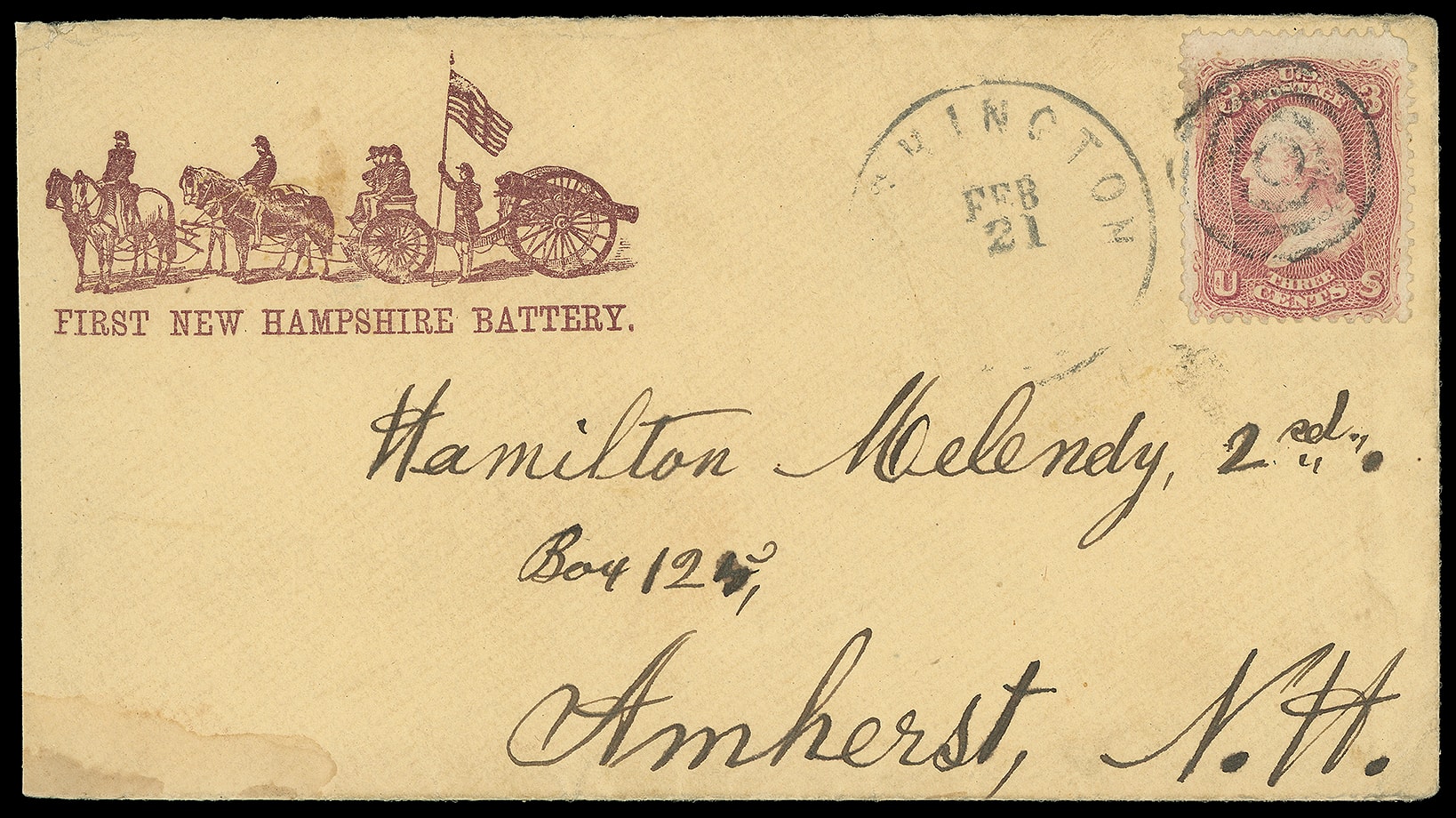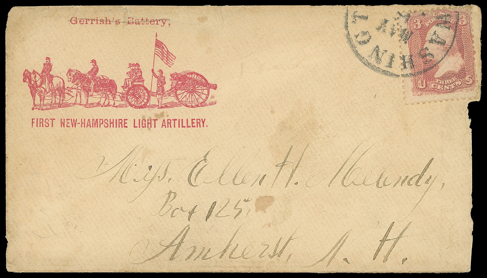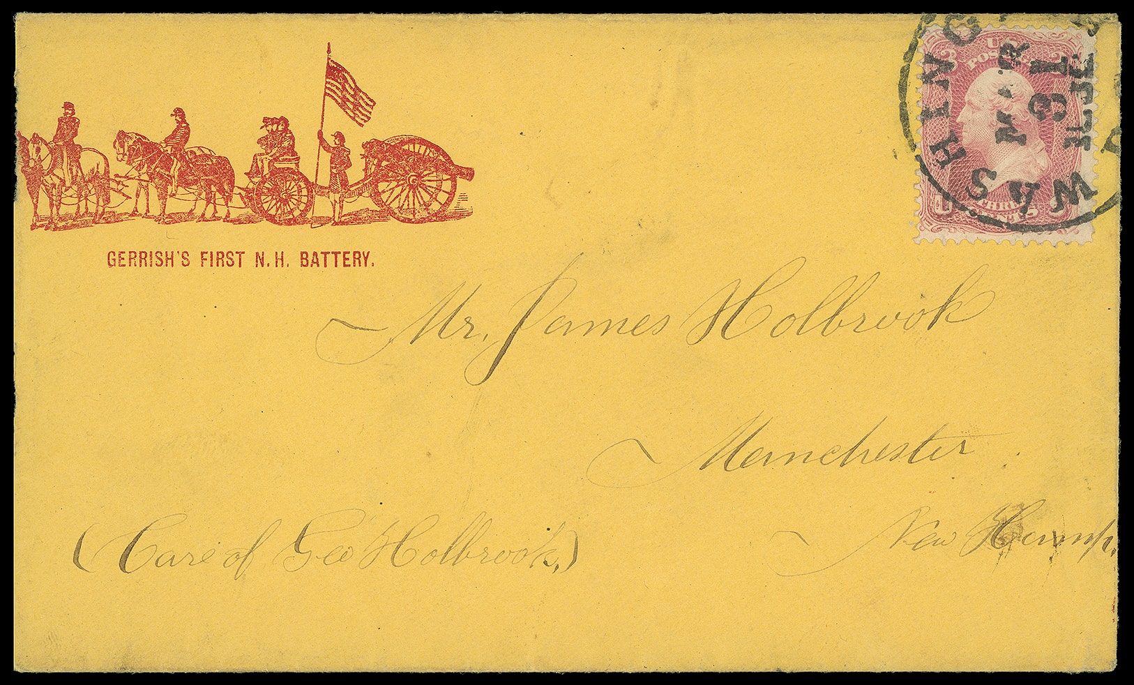 N.H. Battery. Rich red patriotic design showing horse-drawn cannon on cover bearing 3¢ rose (65) tied by "Washington D.C. Mar 31, 1862" cds to Manchester N.H.; reduced a bit at left, Fine, ex-Walcott. Walcott No. 1359 var.;