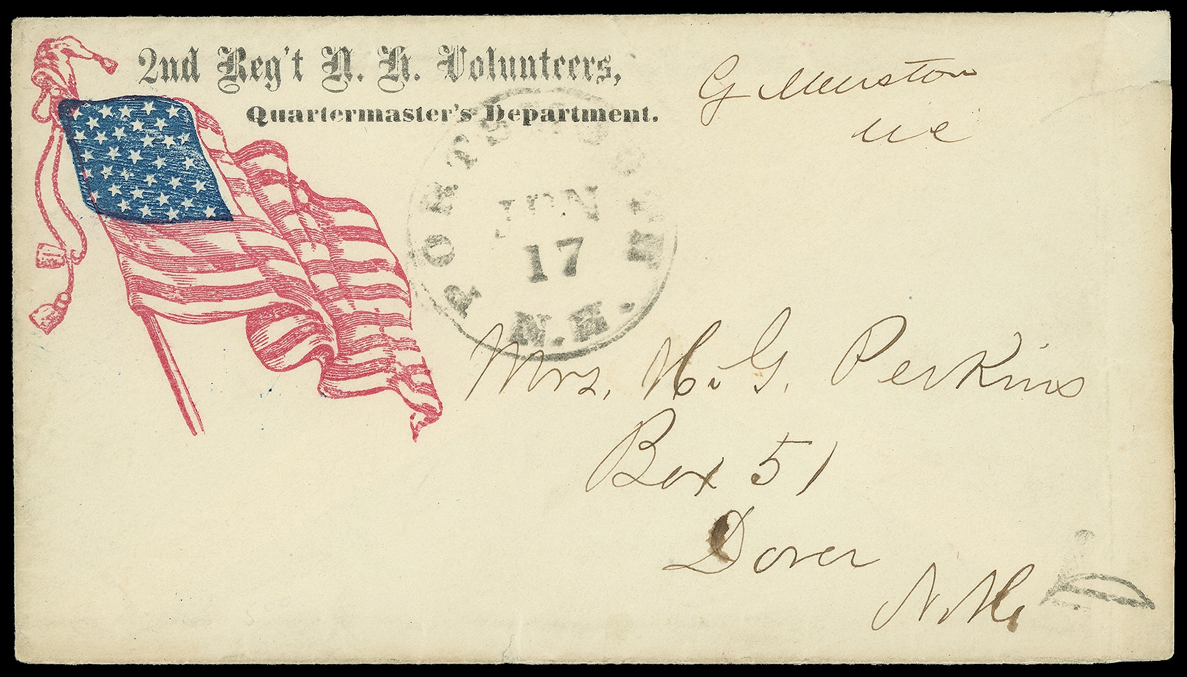 Volunteers, Quartermaster's Department. Regimental imprint on Waving Flag patriotic design on cover with "G. Marston M.C." free frank endorsement to Dover N.H.; edge tear, Very Fine and rare regimental imprint, ex-Bischel.