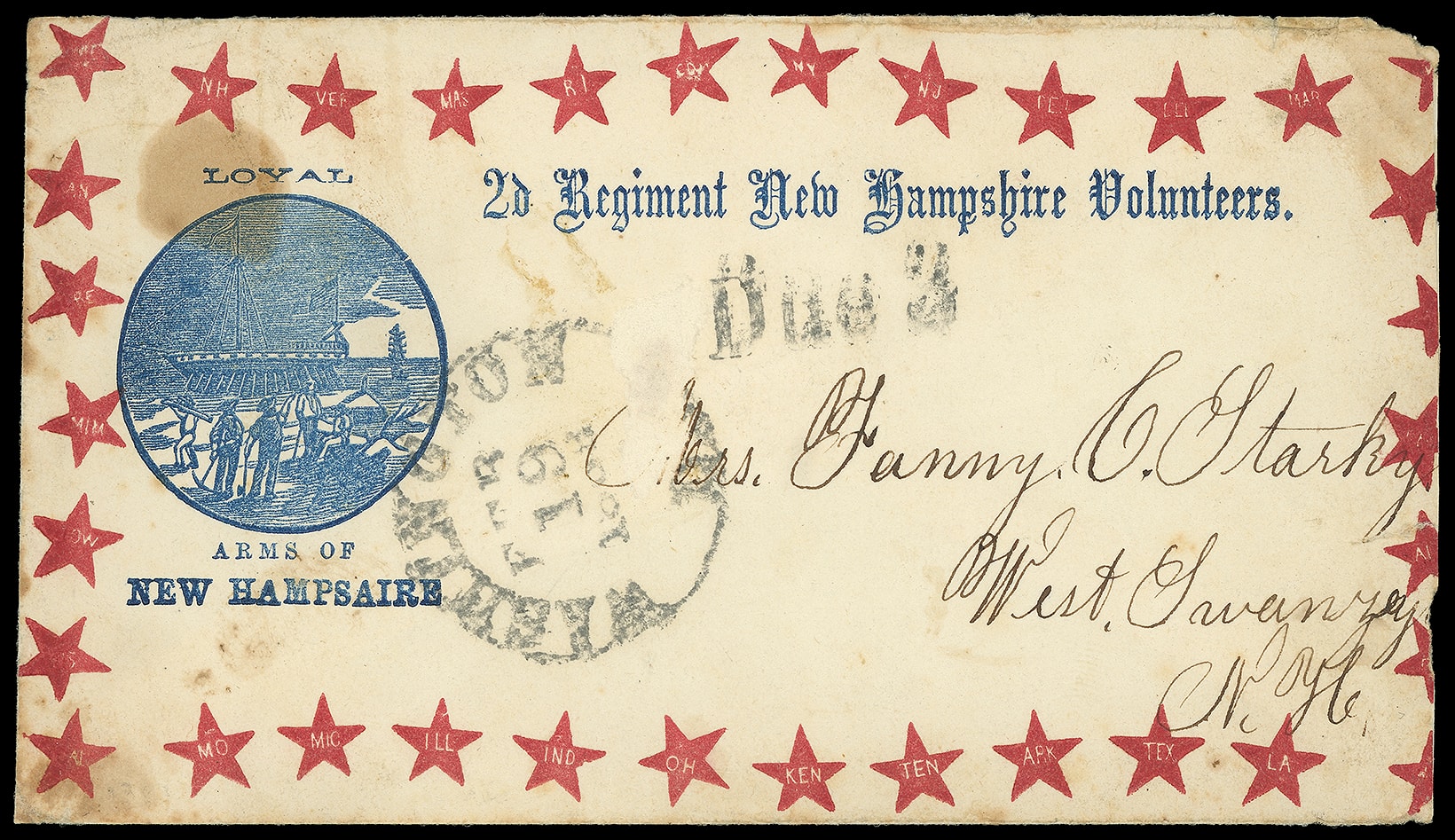 Hampshire Volunteers. Blue regimental imprint on "Loyal Arms of New Hampsaire" overall patriotic design showing state seal and state star border on cover with "Washington D.C. Feb 19, 1861" cds and matching "Due" rating handstamp to West Swanzey