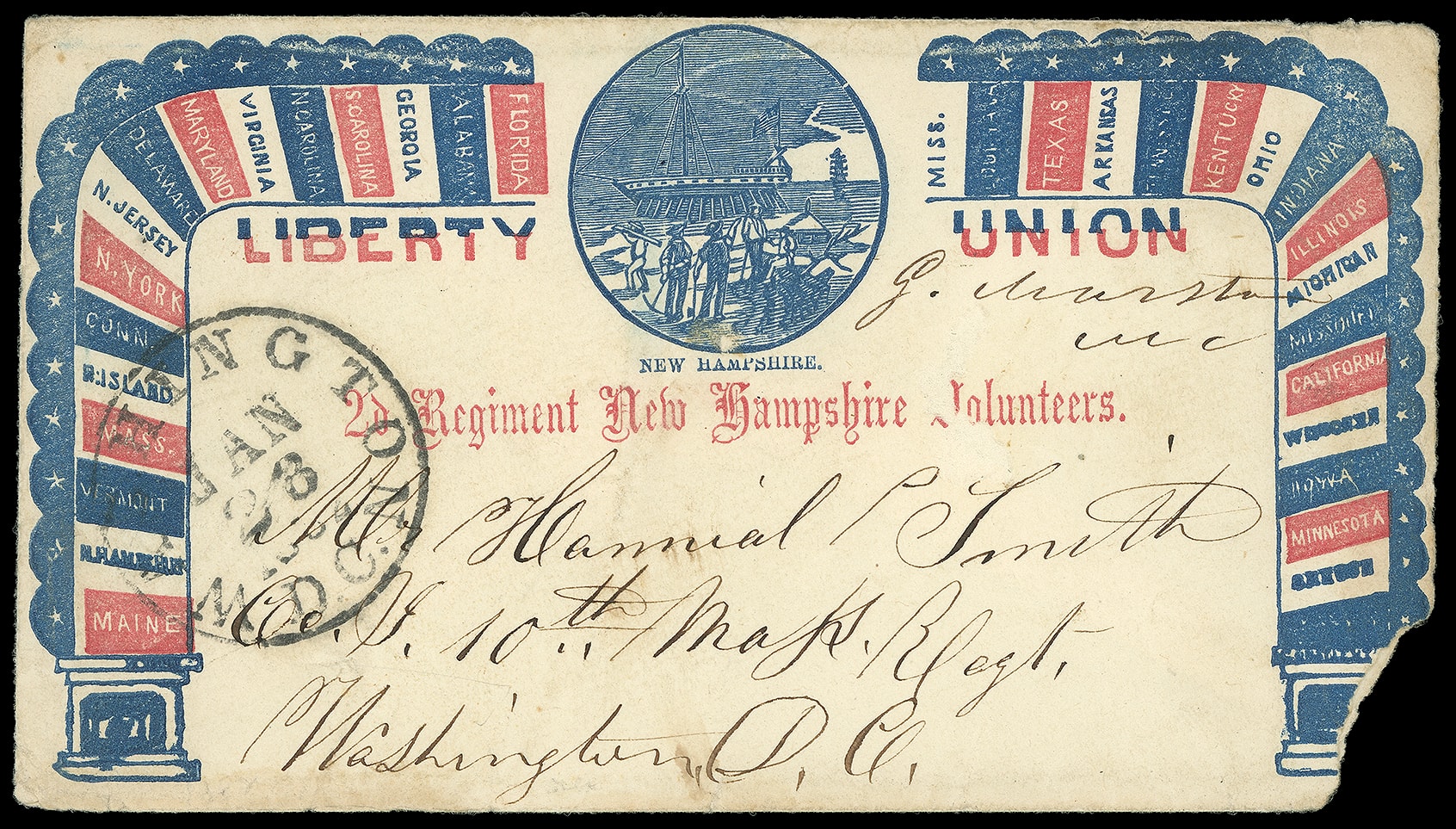 Hampshire Volunteers. Regimental imprint on red and blue Liberty and Union New Hampshire patriotic design with Magee imprint on cover free franked "G. Marston MC", entered mails with "Washington D.C. Jan 28, 1862" cds to Hannial P. Smith, C. V.