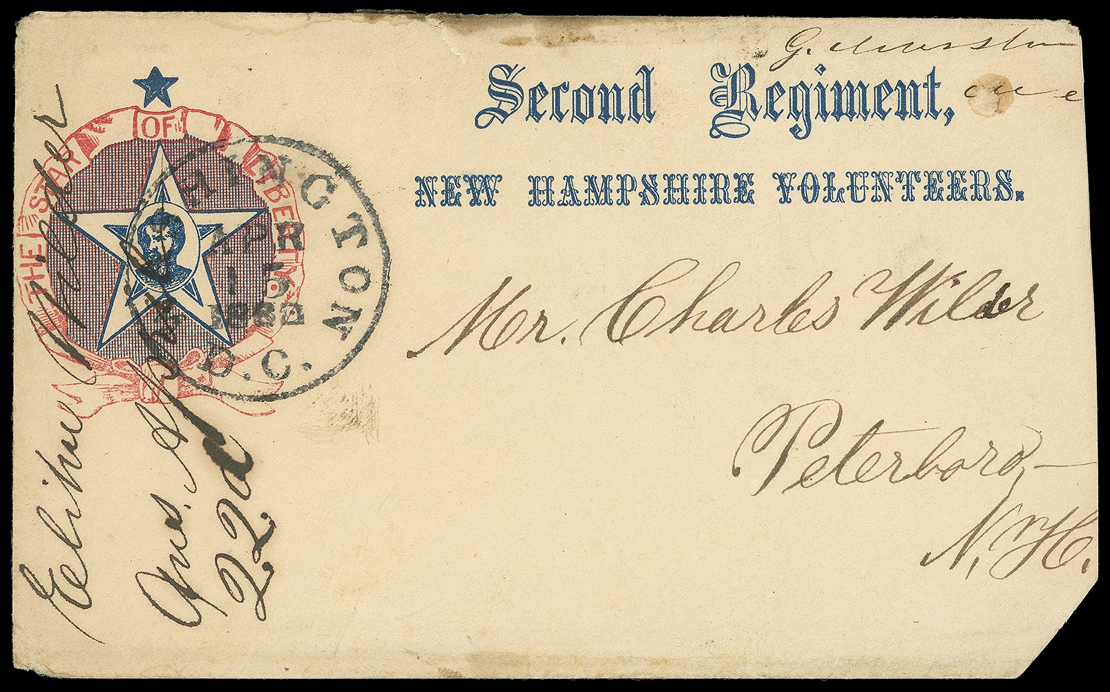 Hampshire Volunteers. Blue regimental imprint on Star of Liberty Gen. McClellan patriotic cover with "G. Marston MC" free frank, entered mails with bold "Washington D.C. Apr 15, 1862" cds to Peterboro N.H., docketed from Elihu Wilder at left;
