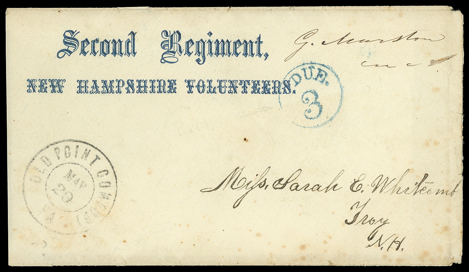 Hampshire Volunteers. Blue regimental imprint on patriotic cover with embossed Union and Constitution flap imprint, red and blue flap piping, entered mails with "Old Point Comfort, Va. May 29" cds and "G. Marston MC" free frank, Baltimore sharp