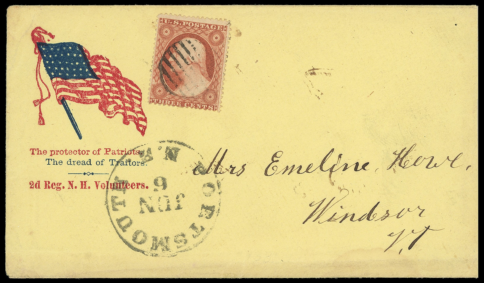 Volunteers. "The Protector of Patriots". Red and blue waving flag patriotic on yellow cover bearing 3¢ dull red, type IV (26A), damaged transfer above lower left rosette, canceled by partial circular grid, matching "Portsmouth N.H.