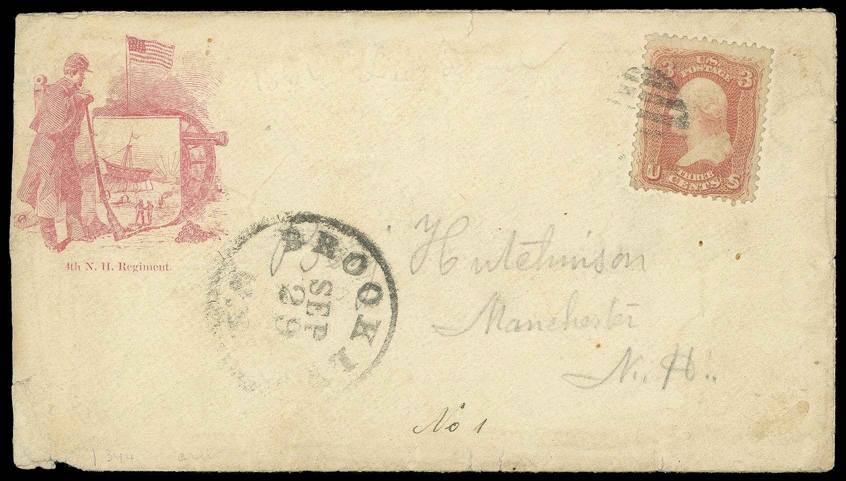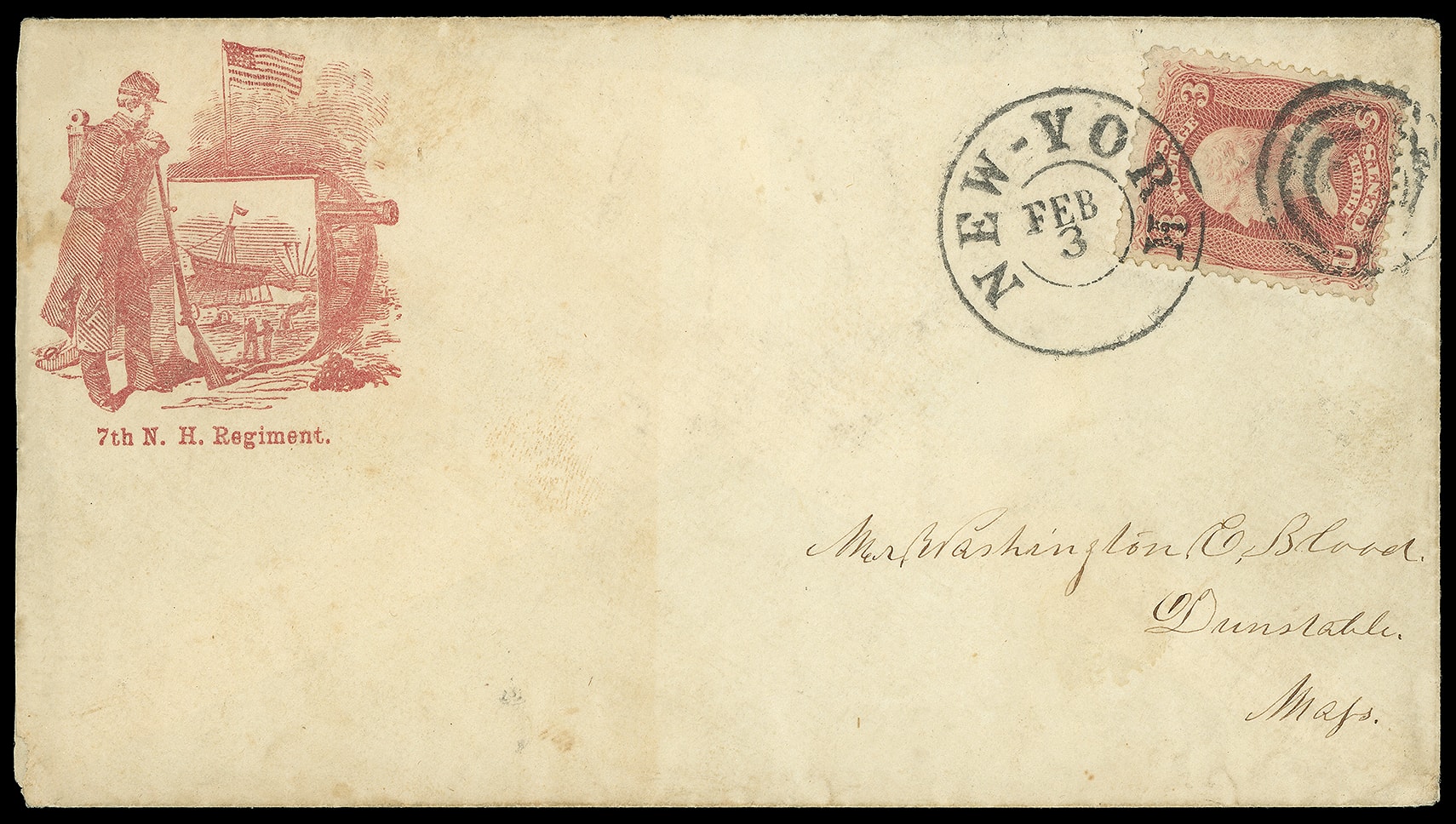 Regiment. Red regimental design on cover bearing 3¢ rose (65) tied by sharp "New-York, Feb 3" duplex with four-ring target cancel to Dunstable Mass.; some edge wear, Very Fine. Walcott No. 1346; Estimate $100 - 150. (Image1)