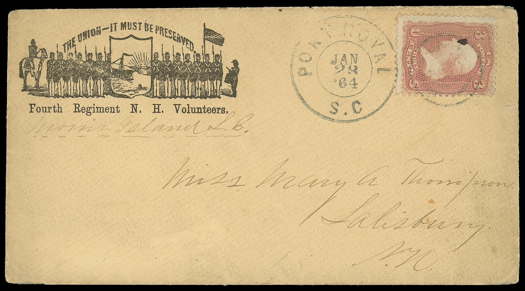 N.H. Volunteers, "The Union - It Must be Preserved". Regimental patriotic showing soldiers and state seal with manuscript "Morris Island S.C." designation below on buff cover bearing 3¢ rose (65) tied by "Port Royal S.C. Jan 23 '64"
