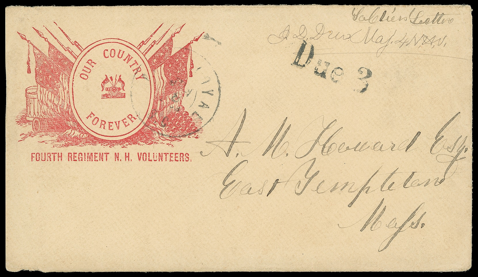 N.H. Volunteers, "Our Country Forever". Red patriotic design on light buff cover endorsed "Soldiers Letter, J.D. Drew, Maj. 4 N.H.V." at top, entered mails with "Port Royal S.C. Jun 8, 1863" cds and matching "Due 3" straightline to East