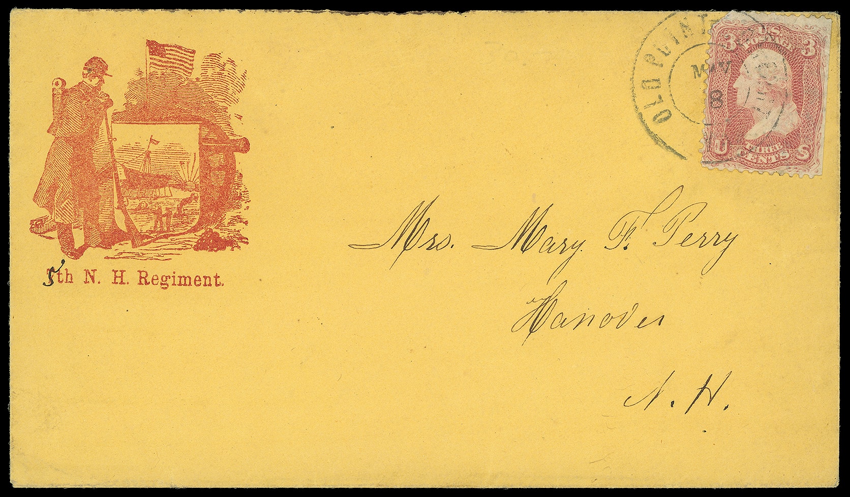 Regiment. Red regimental design with imprint updated in manuscript on circa 1862 orange cover bearing 3¢ rose (65) s.e., faults, tied by "Old Point Comfort, Va. May 8" cds to Hanover N.H.; edge wear, Very Fine. Walcott No.