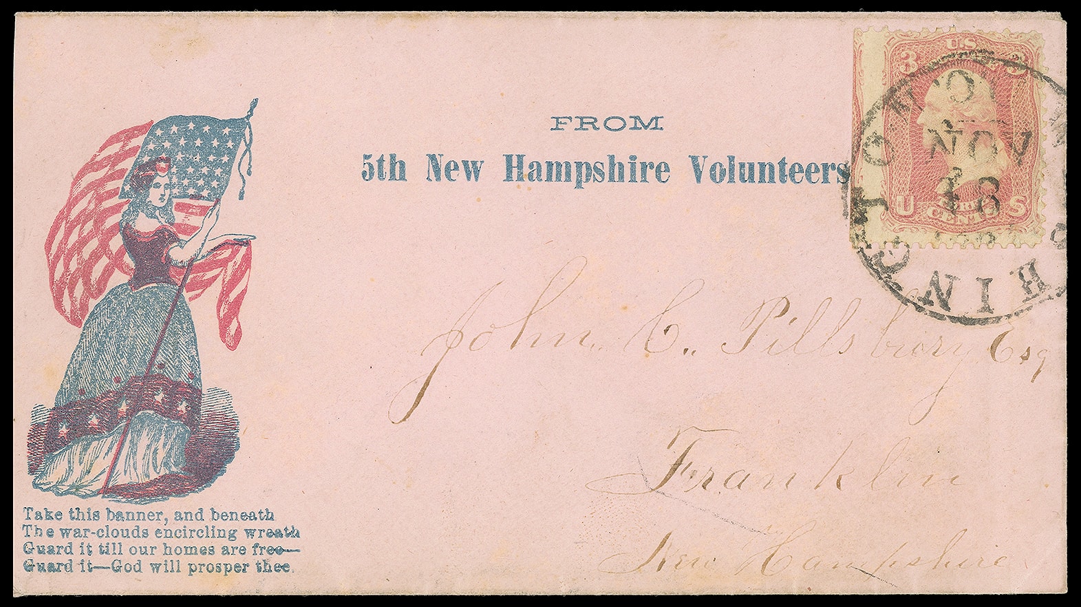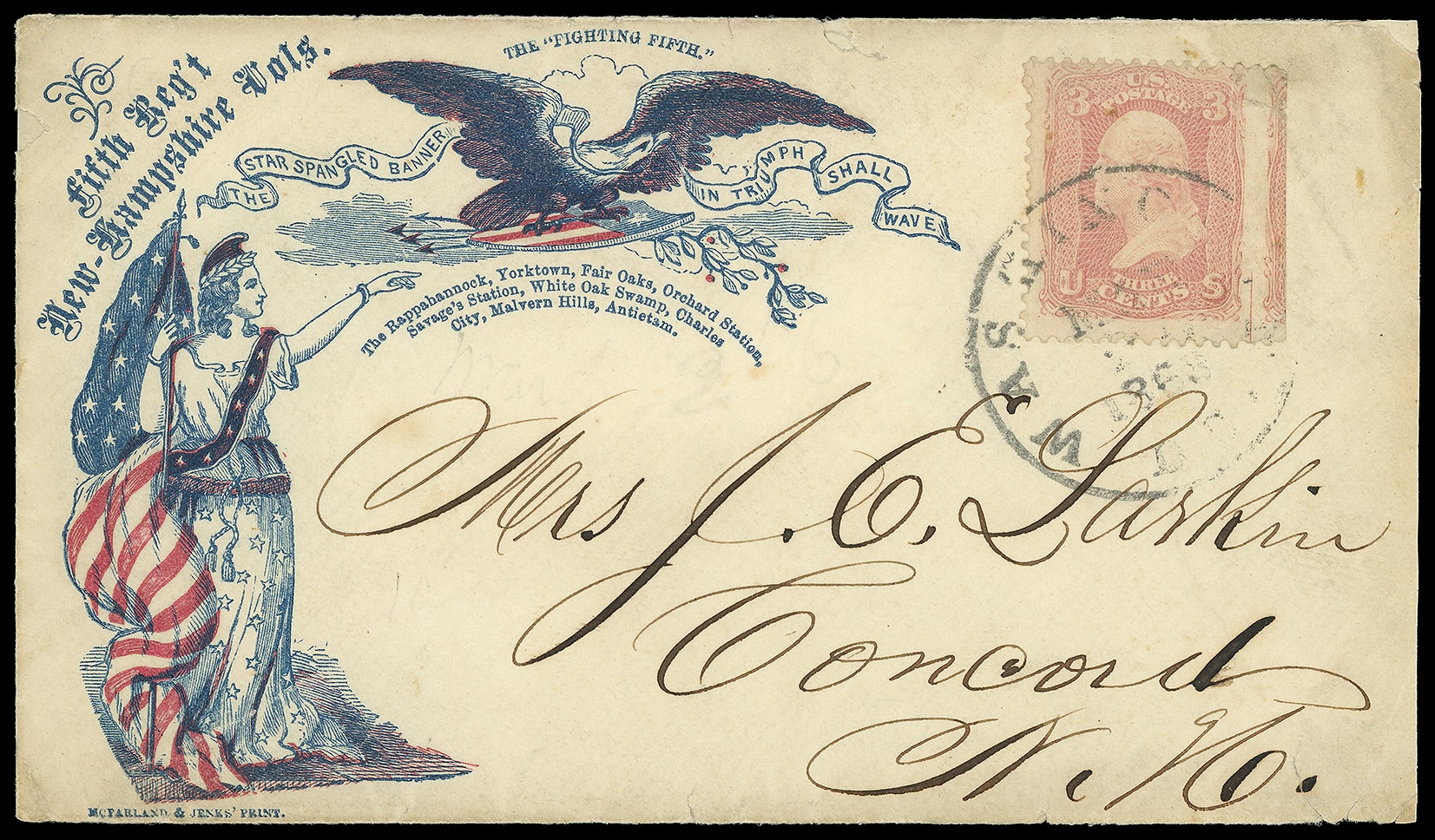 New-Hampshire Vols. Red and blue Lady Liberty and Eagle patriotic design on cover bearing huge 3¢ rose (65) straddle-margin s.e. single, tied by "Washington D.C. May 30, 1863" cds; tiny mended edge flaws and reduced slightly at