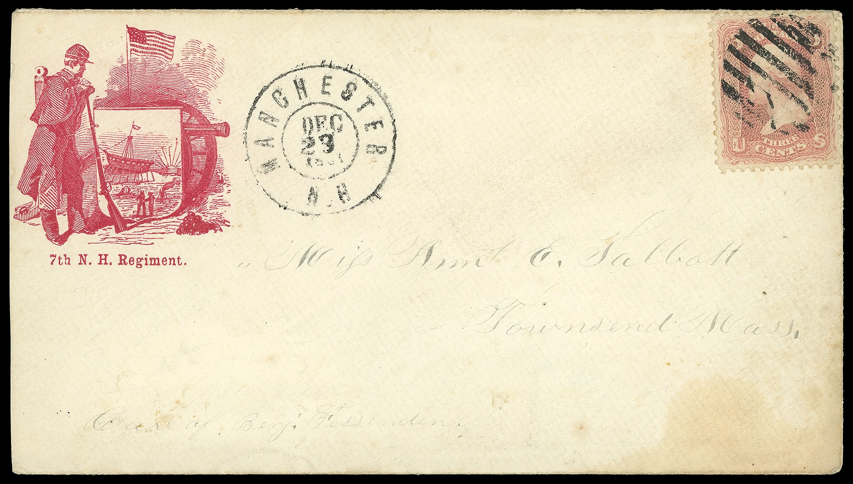 Regiment. Scarlet red regimental design on cover bearing 3¢ rose (65), canceled by open circular grid, matching "Manchester N.H. Dec 23, 1861" cds to Townsend Mass.; reduced slightly at left, faint lower right toning, otherwise Very