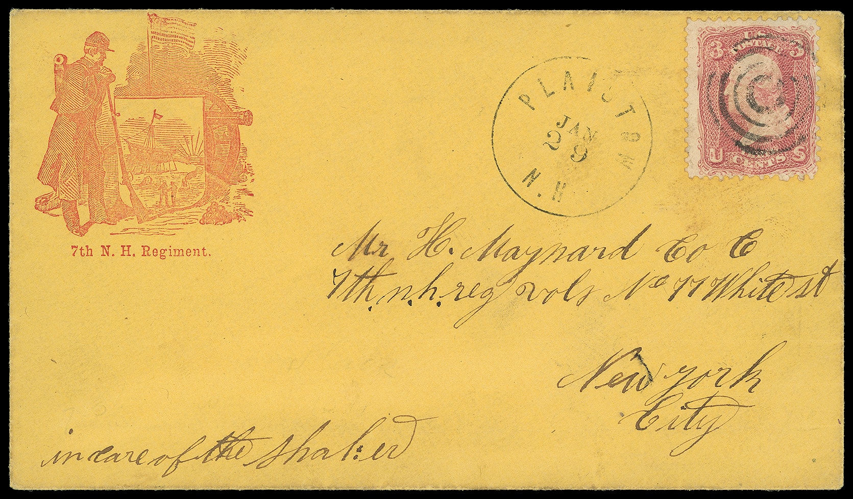 Regiment. Red regimental design on orange cover bearing 3¢ rose (65) tied by four-ring target cancel, matching sharp "Plaistow N.H. Jan 29" cds to H. Maynard, Co C, 7th N.H. Reg. Vols, 77 White St, New York City, Very