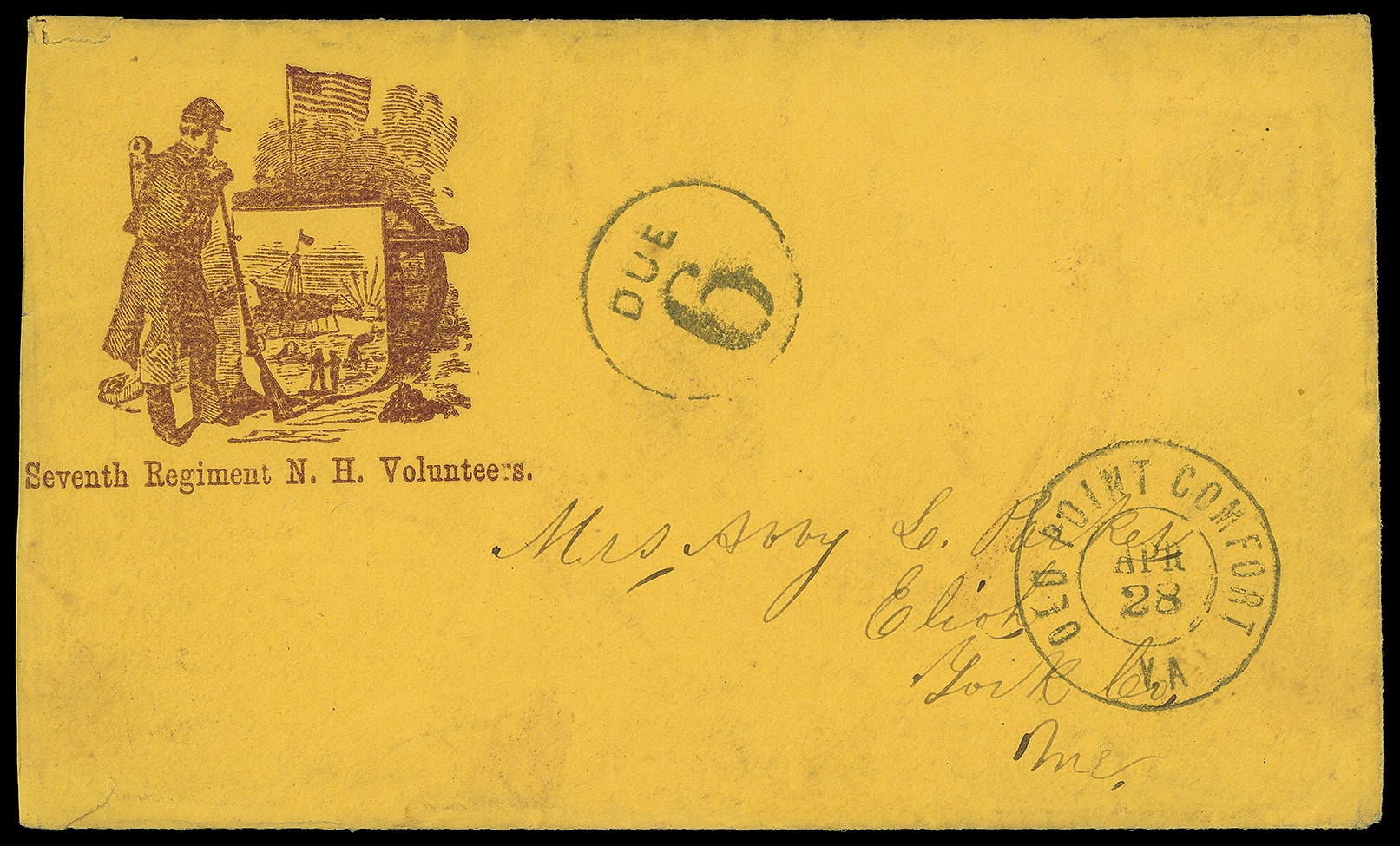 N.H. Volunteers. Dark maroon regimental design on orange cover with sharp "Old Point Comfort Va. Apr 28l cds and matching "Due 6" in circle rating handstamp to Eliot Me.; reduced at leftand some wear, F.-V.F.,