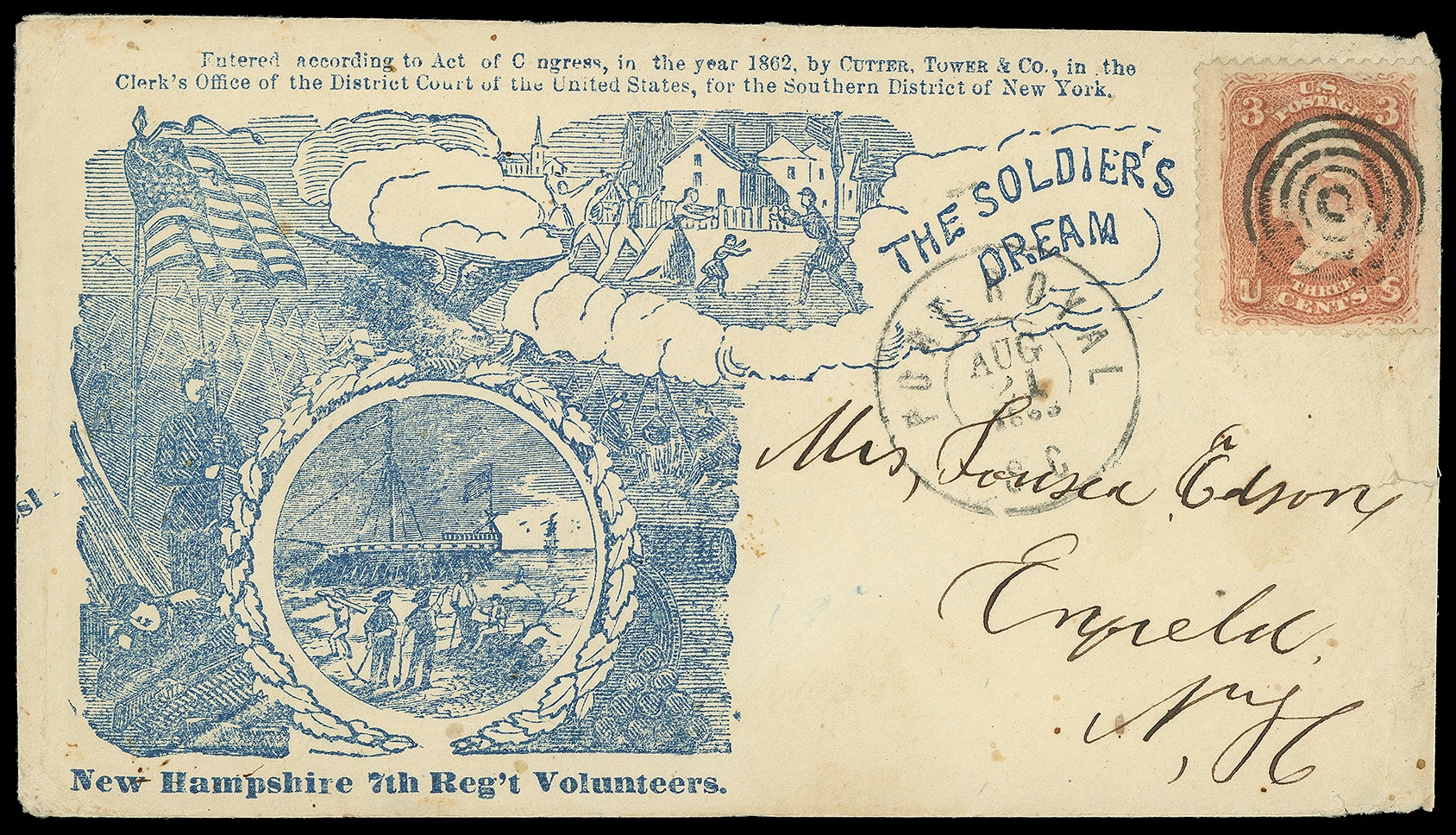 Reg't Volunteers. Blue "The Soldier's Dream" patriotic design with Cutter, Tower & Co. imprint on cover bearing 3¢ rose (65) canceled by five-ring target cancel, matching "Port Royal S.C. Aug 11, 1863" cds to Enfield N.H.; reduced slightly