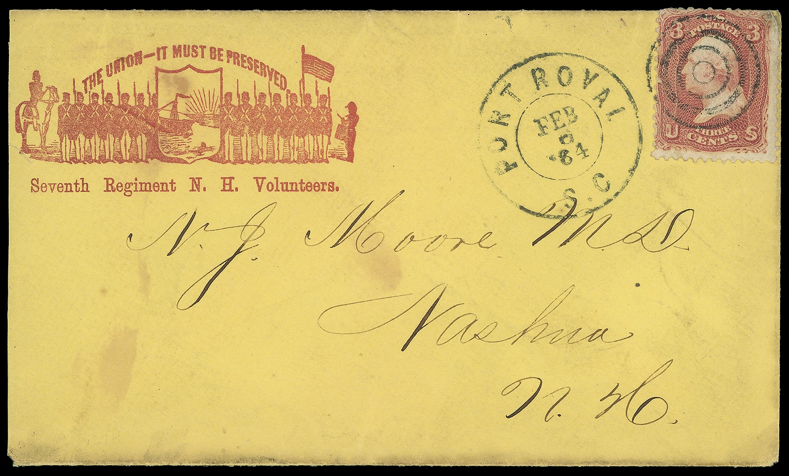 N.H. Volunteers. Red "The Union - It Must be Preserved" regimental patriotic on yellow cover bearing 3¢ rose (65) tied by four-ring target duplexed with "Port Royal S.C. Feb 6 '64" duplex to Nashua N.H.; reduced slightly at left,