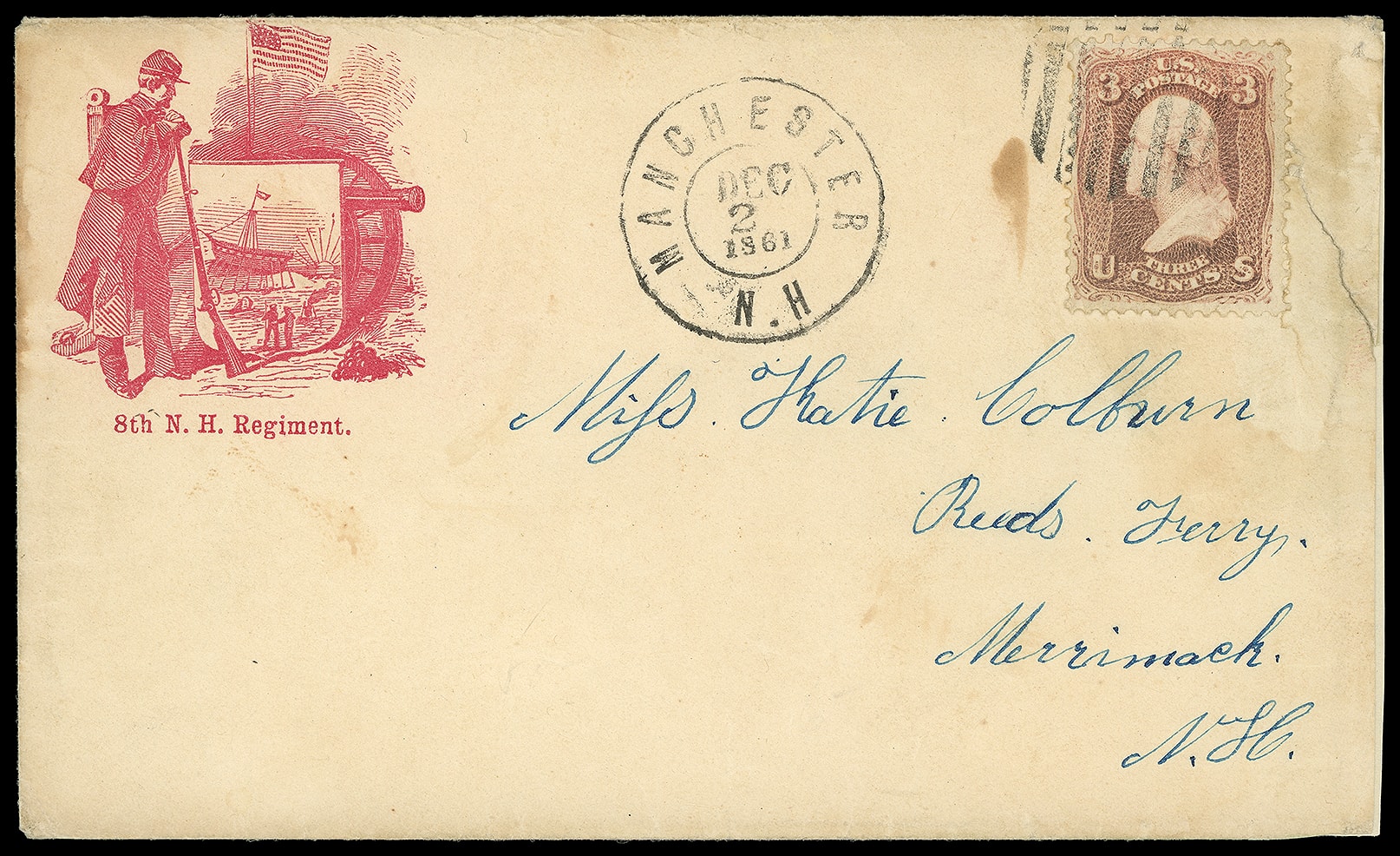 Regiment. Scarlet red regimental patriotic design on cover bearing 3¢ rose (65) tied by open circular grid cancel, matching "Manchester N.H. Dec 2, 1861" cds to Merrimack N.H.; reduced slightly at right with opening tear, small tone spot,