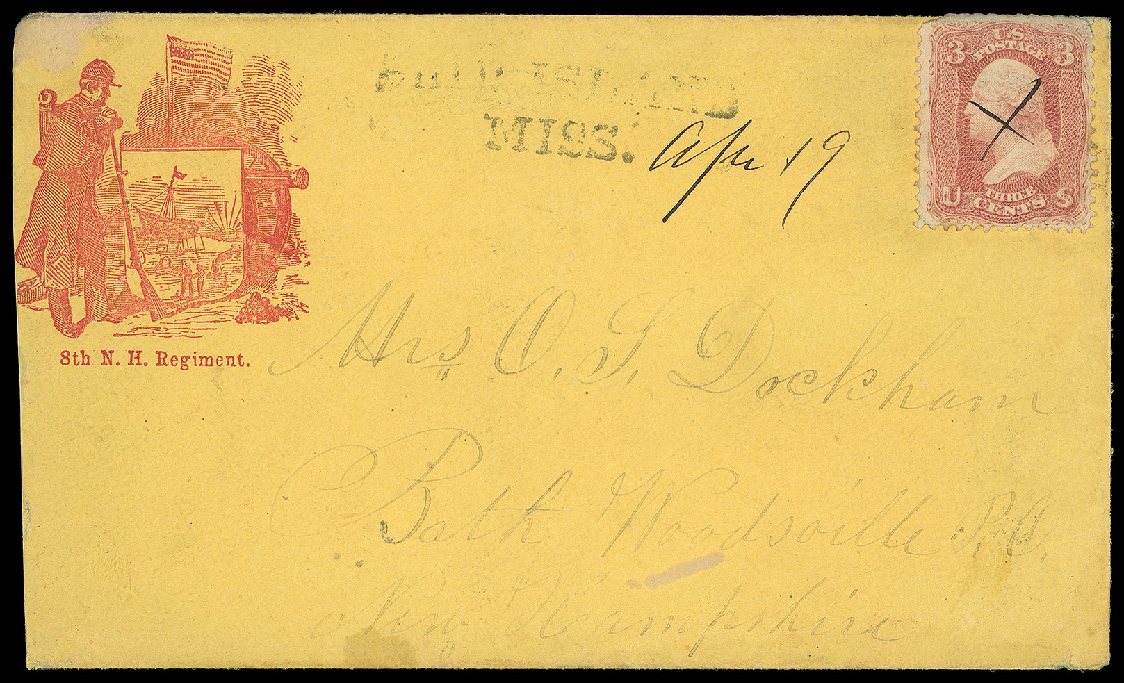 Regiment. Scarlet red regimental patriotic design on orange cover bearing 3¢ rose (65), corner flaw, ms. "X" cancel, "Ship Island, Miss. Apr 19" two-line postmark with matching ms. dating to Woodsville N.H.; reduced at left, small flaws,