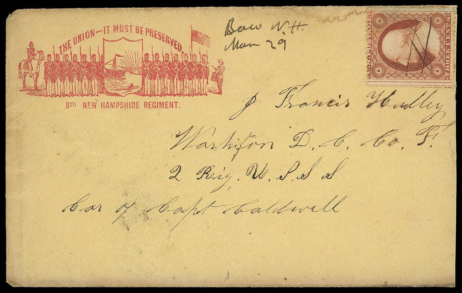 Regiment. Red "The Union - It Must be Preserved" regimental patriotic on buff cover bearing 3¢ dull red (26) straddle-line s.e., ms. cancel, matching "Bow N.H. Mar 29" postmark to J. Francis Hudley, Co. F. 2 Reg. U.S.S.S., Washington D.C.,